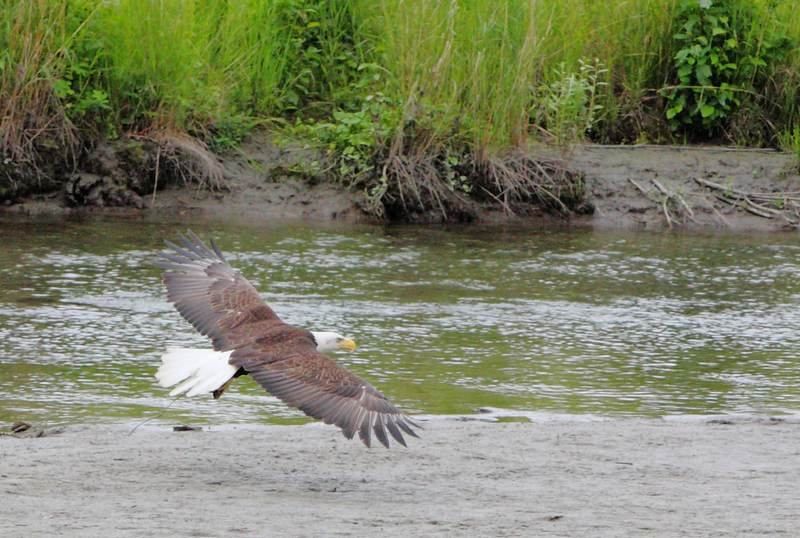 Cette fois ci nous roulons en direction de Valdez par un temps splendide mais comme les nuages sont en fond de vallée nous allons rencontrer très vite le brouillard à la descente. Je fais un stop pour dépanner un américain qui est en panne sur le bord de la route, batterie à plat, nous branchons les câbles sur Hugo et il repart au quart de tour, ma BA de la journée est faite. Arrivés sur Valdez nous nous rendons directement sur la route qui conduit au terminal du pipeline afin de voir les ours qui se gavent de saumon. Pour le moment ils ne sont pas là (les ours) mais je peux shooter à loisir les "bald eagle" qui sont en grand nombre ici. Il est 10h00 et nous allons patienter jusque midi pour enfin voir une mère grizzli avec ses quatre petits mais nous sommes déçus de voir comment cela se passe. Les vacanciers qu'ils soient américains où étrangers sont en nombre et les ours sont complètement apeurés, la mère ayant été séparée de ses petits il faut qu'elle puisse traverser la route pour les rejoindre. La haie que forment les photographes de tous poils l'en empêche, elle devra faire un détour pour rejoindre les "cubs". Finalement tout ce petit monde repartira dans les bois alentours certainement bien plus tranquille qu'au bord de l'eau. Ils vont revenir en soirée pour aller se gaver de saumon, espérons qu'ils soient plus au calme.