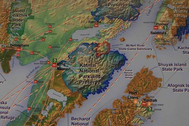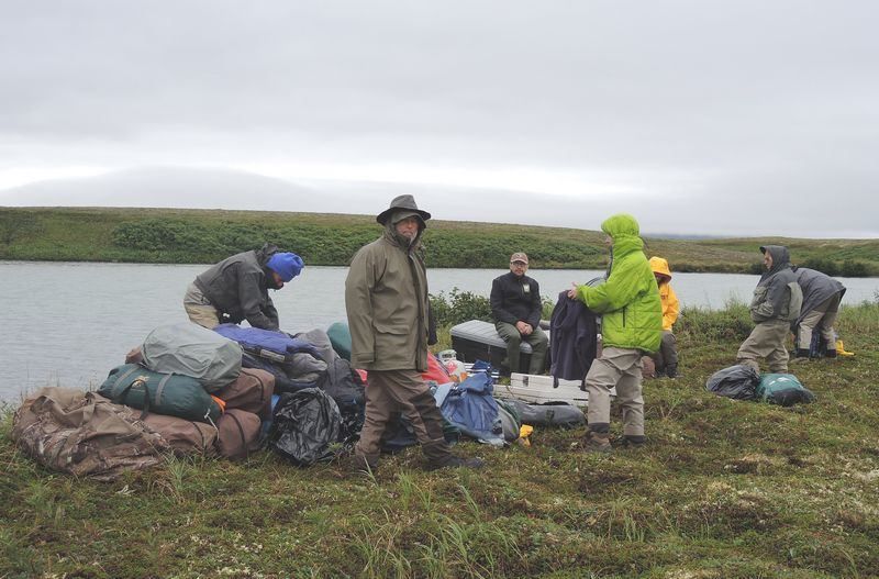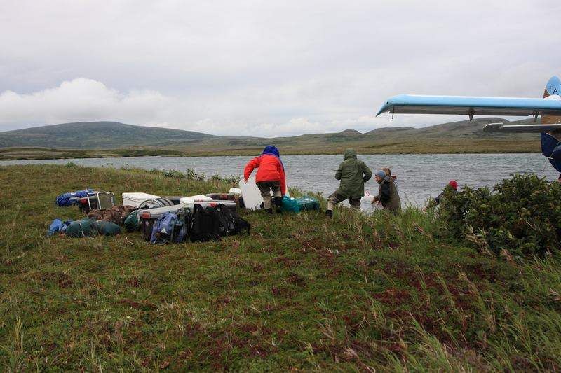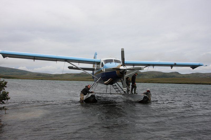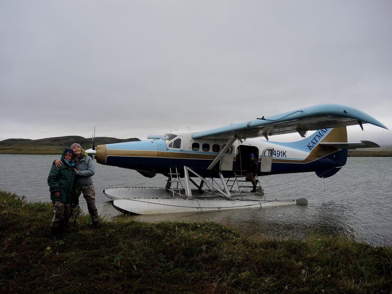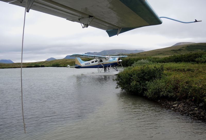 5h30, debout tout le monde, douche, fermeture des sacs, petit déjeuner, chargement du mini bus et nous voici en route vers l'aéroport, comptoir de la Pen Air à 7h00. Tout le matériel nécessaire ainsi que la nourriture représentent un bon nombre de grosses glacières, les sacs de chacun sont également très lourds avec le matériel photo, ordi et autres moyens permettant de décharger les cartes photos. Le vol est annoncé à 9h25 et il durera 1h30 par un temps correct au départ puis devenant très nuageux au sud d'Homer, nous verrons tout de même de magnifiques glaciers et les volcans de la chaîne, quel spectacle. A 11h00 nous nous posons sur King Salmon avec un temps tout gris mais sans pluie donc du beau temps puis nous sommes véhiculés par le personnel de Katmai Air au siège de la petite compagnie d'hydravions qui va nous conduire jusque Crosswind Lake au nord du parc de Katmai. Nous nous changeons de vêtement et enfilons nos waders car la descente des deux hydravions se fera dans l'eau à l'arrivée et il faudra également les décharger. Au bout de cinquante minutes nous survolons la Moraine Creek et apercevons les ours qui semblent en nombre mais également beaucoup de pêcheur, nous sommes en pleine saison de pêche ici en Alaska. Dès que les deux hydravions sont déchargés nous installons le camp derrière de petits arbustes afin de nous protéger du vent d'est qui est le vent des tempêtes et ici il souffle à 150km/h et il devient impossible de maintenir les tentes montées. Nous irons assez vite pour tout installer et partirons pour une première observation des grizzlis depuis une petite plage, les APN chauffent, les cartes se remplissent vite, nous sommes très heureux d'être de nouveau ici sept ans après notre première visite. Soirée coule et dodo vers 20h00 car tout le monde est fatigué et puis demain sera un autre jour!