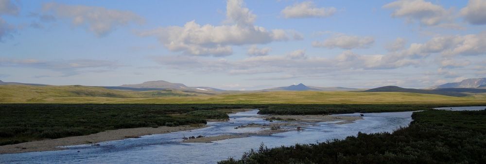la Moraine River depuis la falaise d'où nous pouvions observer une dizaine d'ours tous les jours. Nous traversions à gué pour rejoindre le bras qui part sur la gauche et remontions sur 1km vers un endroit d'où nous pouvions voir nos amis au plus près. Paysage de toundra, venté et froid, mais c'est aussi le pays des ours!