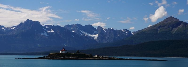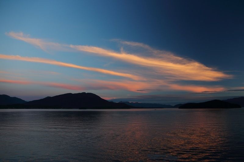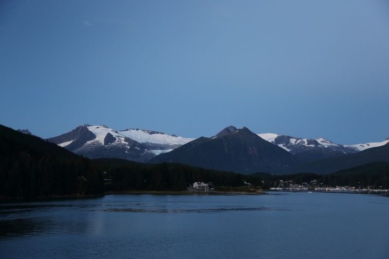 Nous allons continuer ainsi toute la journée et arriver sur Juneau vers 16h30 toujours sous un grand soleil, c'est vraiment très très beau toute cette région. Nous avons des petits glaciers partout, nous apercevons les "bald eagle" perchés dans les sapins et parfois une maison avec un bateau, que font-ils ici? Le coucher de soleil sur la baie de Juneau est un grand moment, les couleurs sont extraordinaires et bien évidemment je capte tout cela. Le dîner sera meilleur que le déjeuner, saumon grillé avec purée (maison!) et une pomme, en principe cela devrait passer comme il faut, nous verrons bien et nous partons nous coucher dès que le bateau quitte son amarrage. A demain pour la suite de notre découverte de l'Inside Passage.