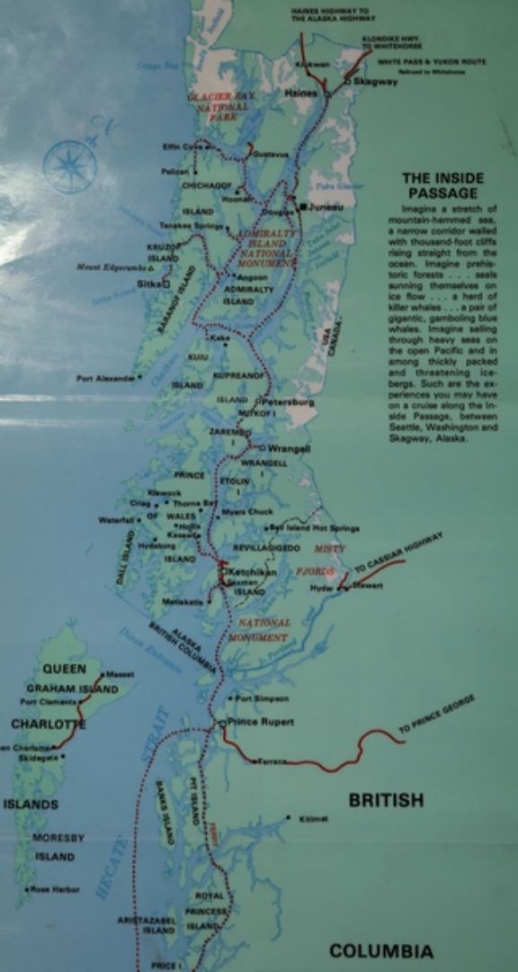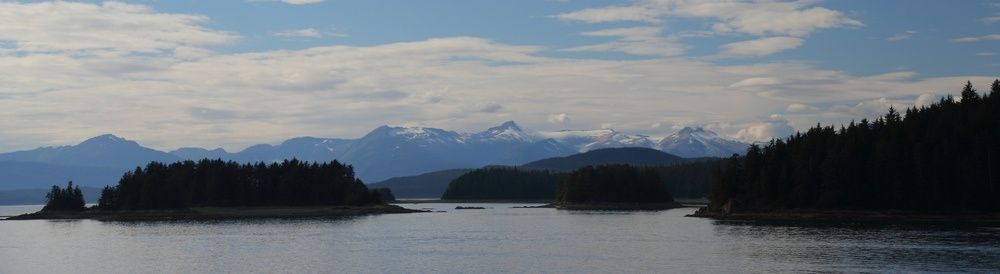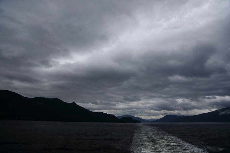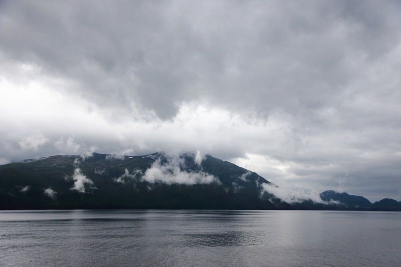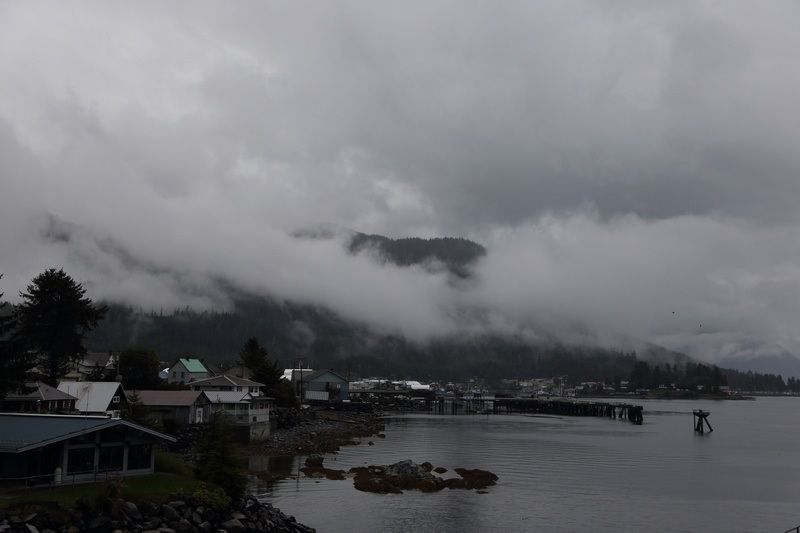 Bon la nuit ne fût pas terrible mais sur un bateau nous savions ce qui nous attendait et en plus ce matin il pleut, nous sommes dans les nuages, rien à voir avec hier, nous nous en contenterons. Vers 4h00 du matin nous avons fait un stop à Petersburg puis ensuite nous sommes repartis sur le port de Wrangell où nous sommes arrivés à 8h00. Depuis nous filons sur Ketchikan où nous arriverons dans le milieu de l'après midi et vers 1h00 du matin nous débarquerons sur Prince Rupert, encore une très courte nuit à venir, c'est notre choix alors nous ne nous plaignons pas. Les paysages sont moins captivants que ceux d'hier, ici c'est plus de la "rain forest" qu'autre chose, les glaciers sont plus loin sur l'intérieur. Nulle trace de vie sur cette portion de la côte et pourtant nous y voyons beaucoup de bateaux de pêche, la région doit être bonne pour cette profession.