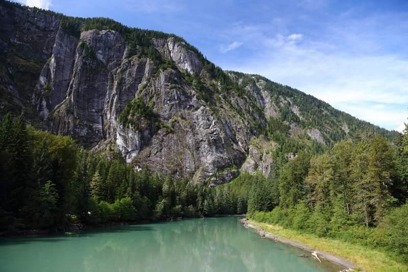 Nous sortons de Prince Rupert après avoir fait les courses au Safeway du coin et profiter d'une connexion WiFi pour mettre le site à jour et finalement nous partons vers 11h30 en direction de Prince George 730km plus haut. Nous allons vite faire un stop pour prendre un sentier sympathique qui va nous conduire au bord d'une rivière tout en traversant la "rain forest" et sous un beau ciel bleu, profitons-en.