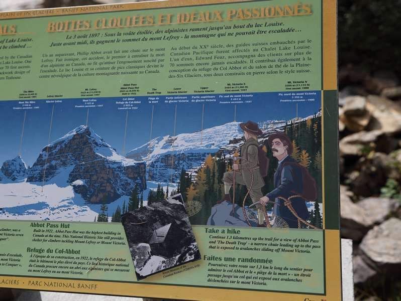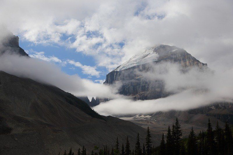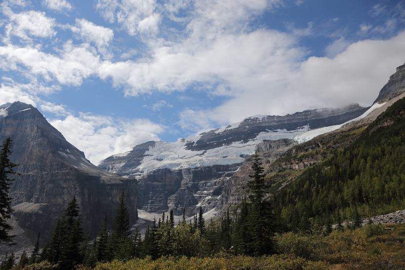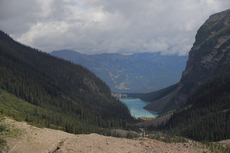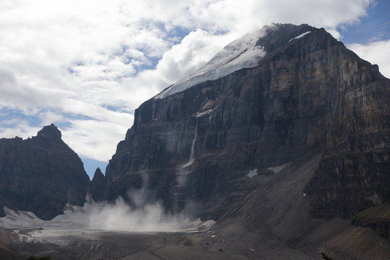 Une nuit sans pluie, autrement dit nous avons bien dormi car la pluie sur la cellule fait beaucoup de bruit, enfin cela est valable pour tous les camping car. Ce matin malgré tout le ciel est plombé, les nuages ne sont pas loin et comme le beau temps est attendu pour demain, ne soyons pas pressés. Nous partons tout de même en balade et nous allons nous faire la randonnée de "Plain of the six glaciers" avec un retour par le Lake Agnés soit une promenade d'environ 14km. Le sentier part du bord du Lake Louise au pied de l'hôtel "HLM" vraiment affreux et qui n'a rien à faire dans un tel lieu, mais bon il est là faisons avec. A 10h30 le parking est saturé, incroyable le monde qu'il y a encore, nous prenons le sentier, dépassons un maximum de personnes qui se baladent au bord du lac puis nous grimpons vers les "six glaciers". Le temps semble s'améliorer, des trouées de ciel bleu apparaissent, mais c'est très furtif. Nous atteignons le but de notre balade, faisons un pique-nique rapide et redescendons sous les gouttes en passant par un autre sentier qui va nous conduire au Lake Agnes. Nous assistons à la chute d’un énorme sérac depuis le glacier du Mont Lefroy, impressionnant. Toute cette partie se fait sans presque personne mais nous allons vite retrouver la foule après le lac et ensuite les rives sont bondées et devant le HLM c'est de la folie, vite tirons nous d'ici et rejoignons notre campground où là nous serons au calme. La pluie ne nous quitte pas, nous sommes septique quant au soleil pour demain, bon restons optimistes, nous verrons demain et demain sera un autre jour.