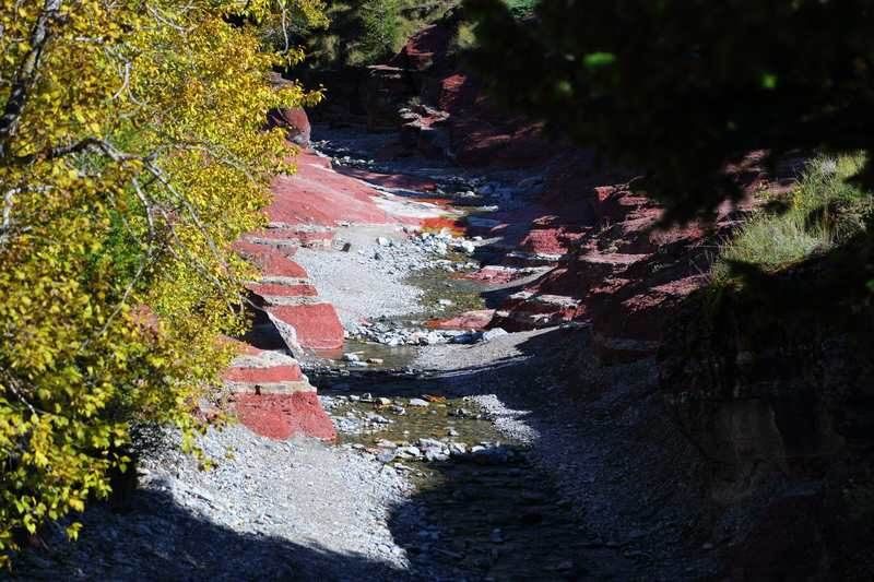 Soleil éclatant ce matin, la journée va être superbe et il fait déjà très bon à 8h00. Nous sommes vite sur pied et prêts à partir à 9h00, de belles balades nous attendent ce jour. Nous prenons la route du Red Rock Canyon car les autres accès au parc sont fermés à cause des ours qui se nourrissent de baies dans les vallées et qui sont potentiellement dangereux. Nous aurons la chance de voir tout de même un ours noir sur la route, je me suis arrêté assez loin pour pouvoir l'observer mais dès qu'il nous a vu il est rentré dans les sous-bois et au revoir, impossible de le retrouver.