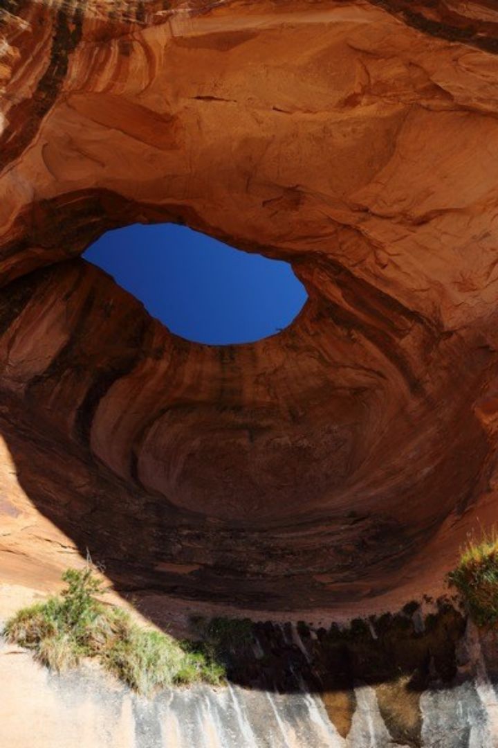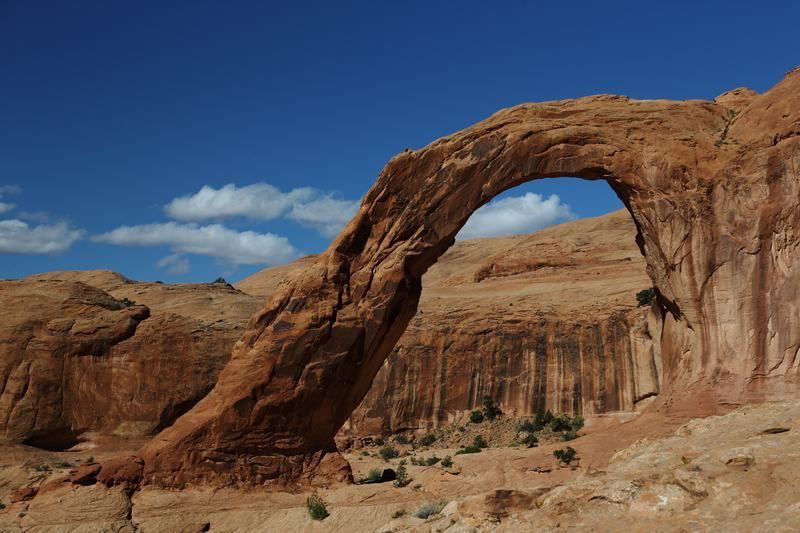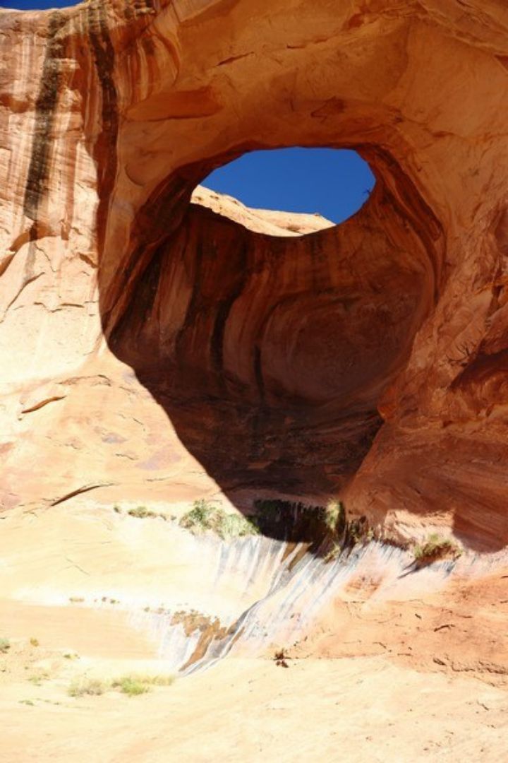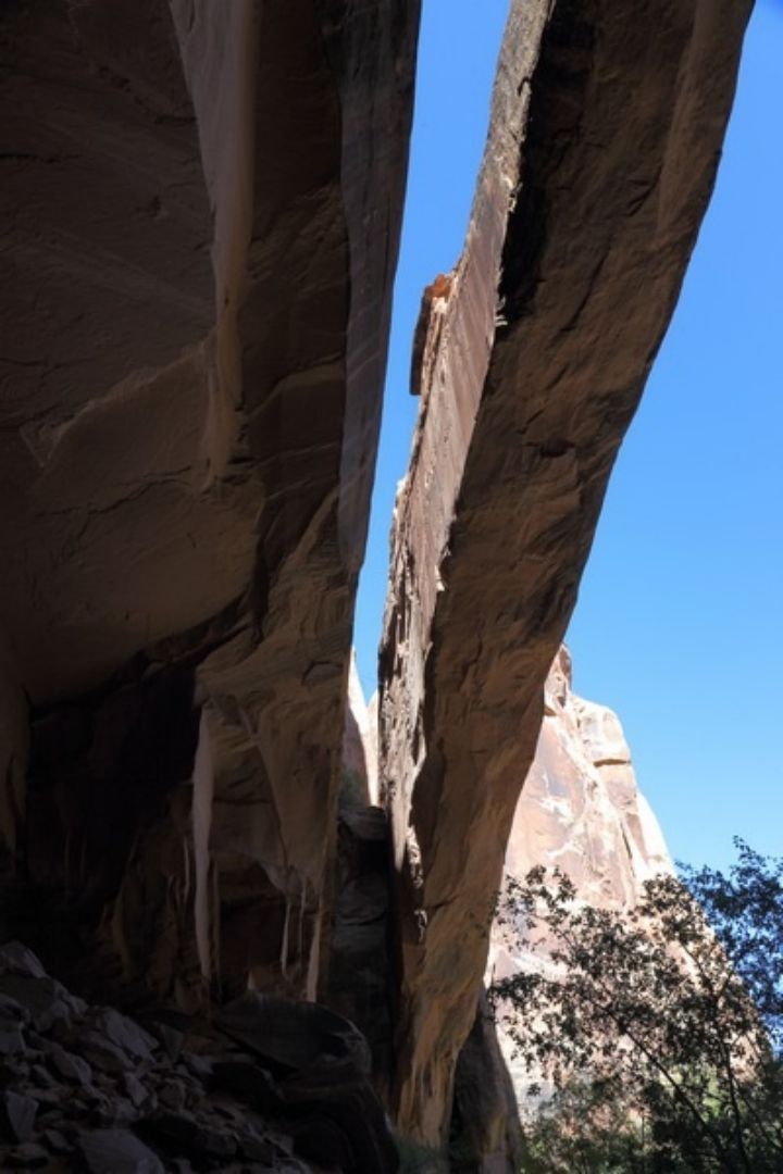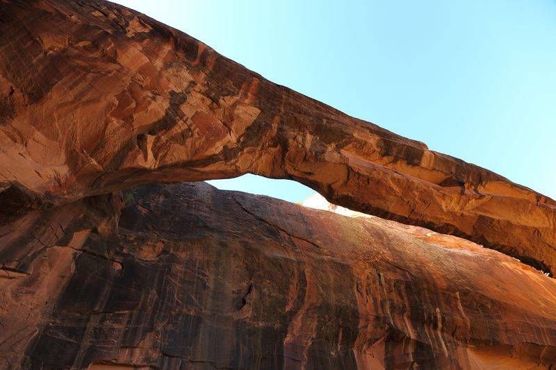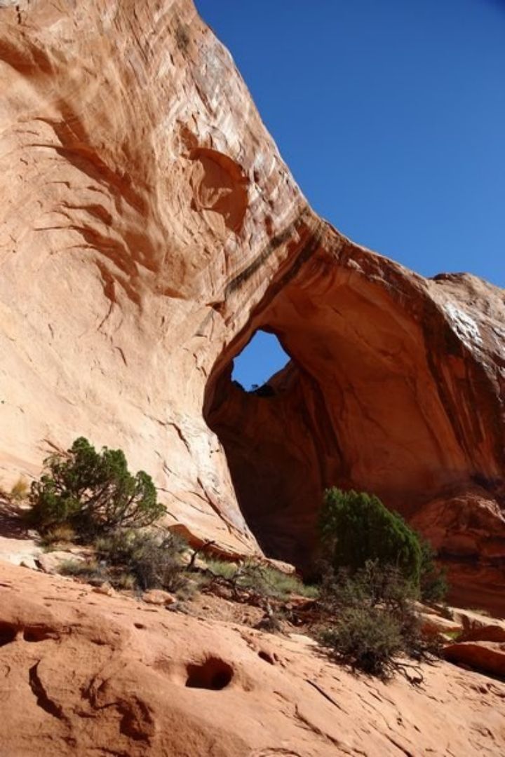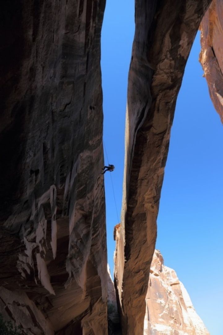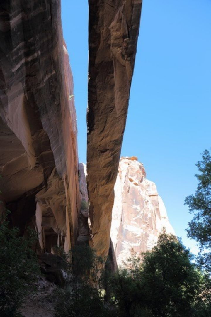 Une année de plus pour nous deux, c'est notre anniversaire ce jour et nous allons fêter cela par une belle balade qui va nous mener, par un beau canyon, au pied d'une magnifique arche appelée Morning Glory Natural Bridge, 172 mètres de long, vraiment très beau. Nous prenons le sentier vers neuf heures et longeons le petit ruisseau très clair avec de nombreux alevins et poissons d'eau douce. Nous allons le traverser de nombreuses fois et poursuivre notre route jusque sous le bridge. Je vais pouvoir photographier des varappeurs qui descendent en rappel la paroi à proximité, l'envie est grande de les imiter surtout quand je vois ces merveilleuses parois qui nous entourent. Nous retournons au parking que nous atteindrons à onze heures trente, soit une heure et demi de moins que le temps donné sur le panneau au départ du sentier, nous commençons à retrouver la forme.