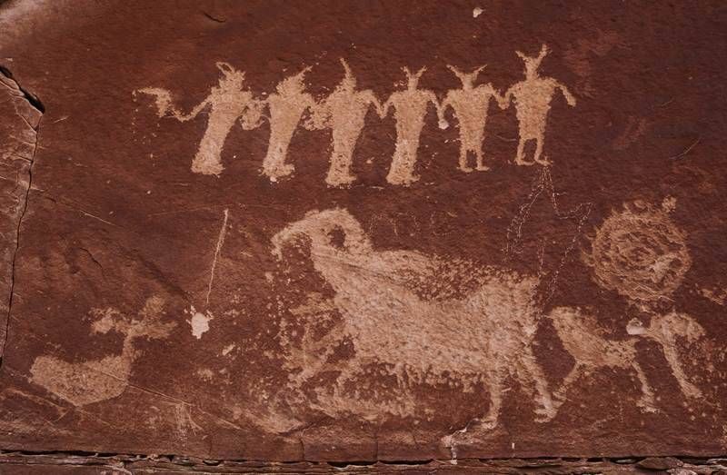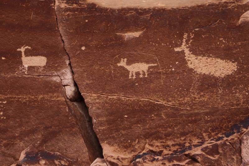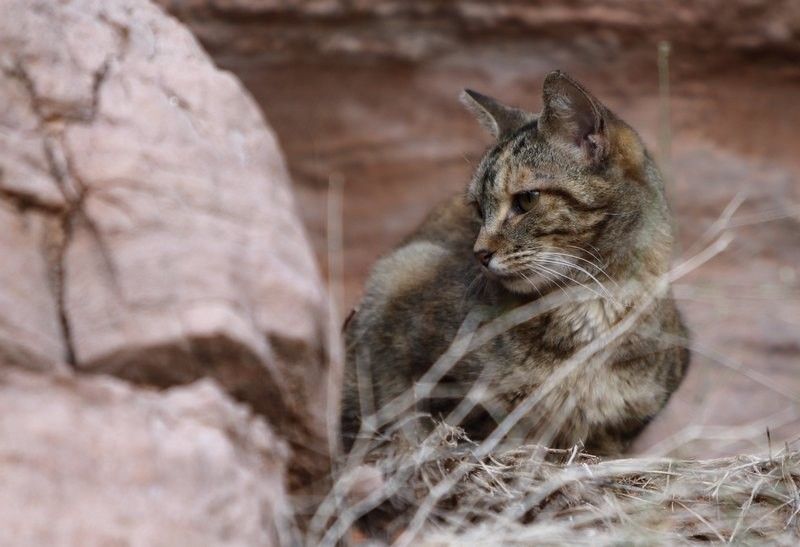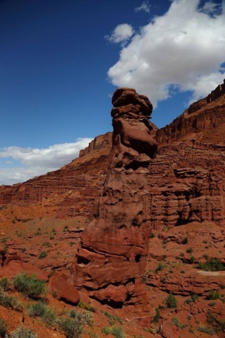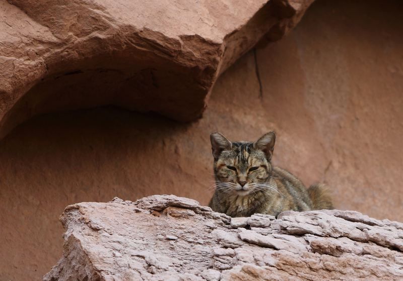 Nous prenons notre temps pour redescendre, croisons une française qui nous demande si nous sommes les français qui voyage avec le gros 4x4 et nous entamons une discussion bien sympathique avec cette dame qui vit aux USA depuis 35 ans. Nous sommes de retour chez Hugo vers midi, nous allons rentrer au campground que nous avons réservé ce matin en passant sinon nous n'aurions pas eu de place et déjeunons d'un très bon filet de saumon sauvage acheté à Moab. Cet après -midi il me faut faire tout le graissage d'Hugo, je vais y passer deux heures, rien ne m'échappe, la suspension en a besoin. Vers 17h00 nous partons à pied pour découvrir des pétroglyphes quand Françoise aperçoit un magnifique chat sauvage, séance photos, je m'approche doucement, il ne bouge pas, puis fait un saut sur le côté, il me regarde, sacré morceau de chat en attendant, c'est vraiment gros.