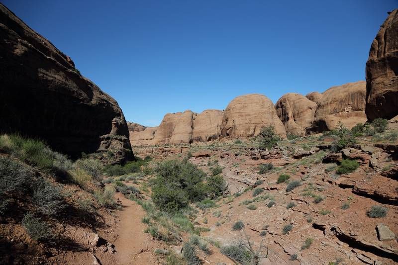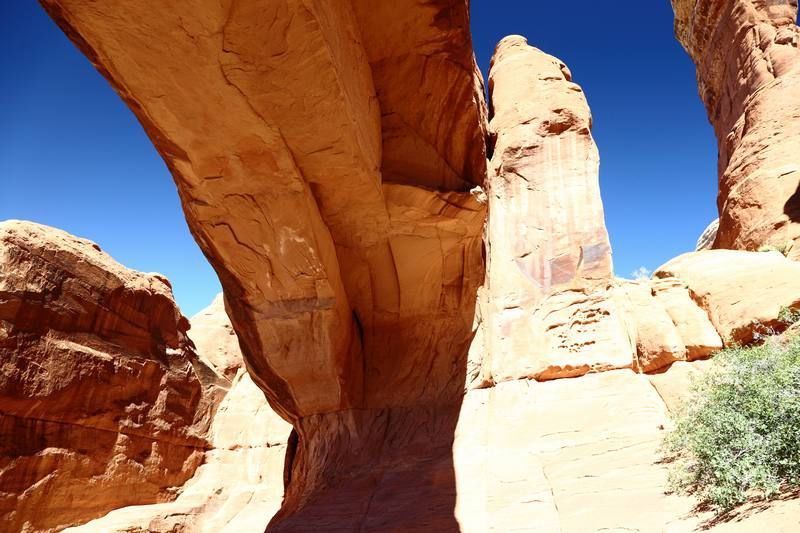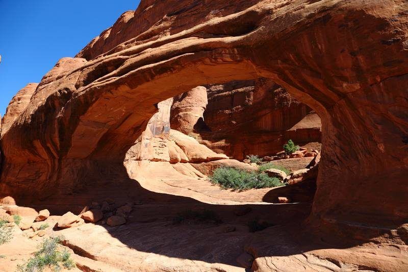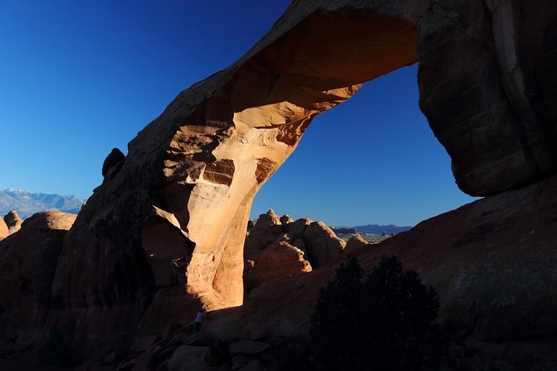 Nous arrivons au campground, une pancarte annonce "full", nous entrons tout de même et allons jusqu'au bout, les "host" sont sur leur petite voiture électrique, ils font le tour, nous voyons un poteau sans écriteau, nous entrons sur le site et Françoise va voir les "host" qui lui dise que la place est libre pour deux nuits mais qu'elle est louée pour les jours après, chouette, nous prenons les deux nuits, quelle chance car c'est la seule de libre. Une fois payé nous repartons vers notre balade du jour à savoir prendre la Salt Valley et aller jusque Klondike Bluffs puis marcher jusque Tower Arch distante de six kilomètres A/R depuis le parking. La piste qui n'est pas difficile par temps sec est tout de même pénible car elle est entièrement en "tôle ondulée" et ça je n'aime pas du tout. Le départ du sentier est très raide mais nous avons la vue sur les Klondike Bluffs et c'est très beau. Nous arrivons vite sur un col et de là descente presque en courant avant de nous trouver sur une dune de sable qu'il va falloir monter, là c'est pénible mais cela ne dure pas trop longtemps. Encore quelques centaines de mètres et nous voici au pied de l'arche, magnifique dans le soleil, il y a un autre couple qui fait des photos. nous allons rester là une bonne demi-heure et faire le chemin inverse qui va nous reconduire au parking un peu avant treize heures. Il fait très chaud surtout pour marcher, nous retournons nous poser au campground et en soirée nous partirons faire deux autres arches toujours à pied pour profiter du coucher de soleil, quelle belle journée.