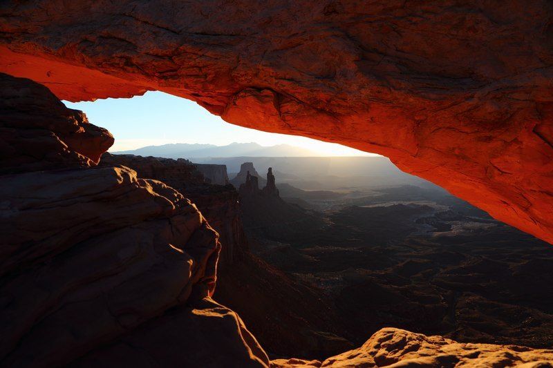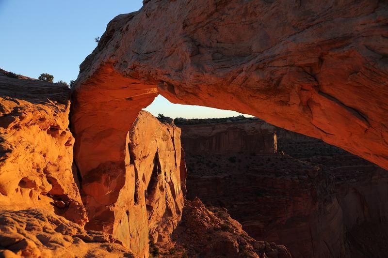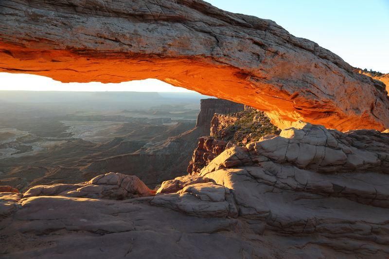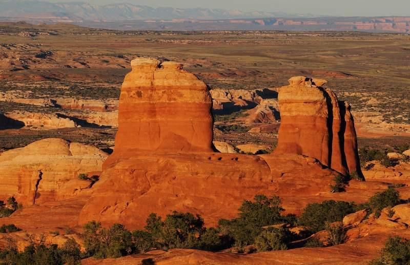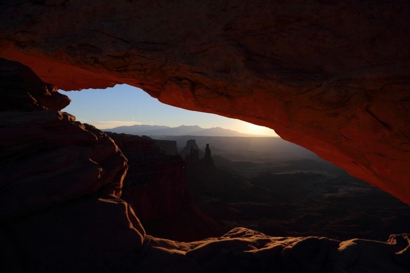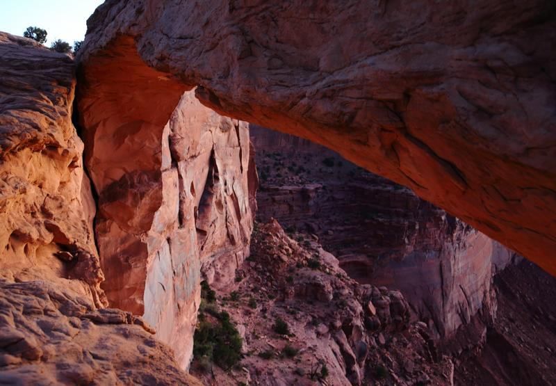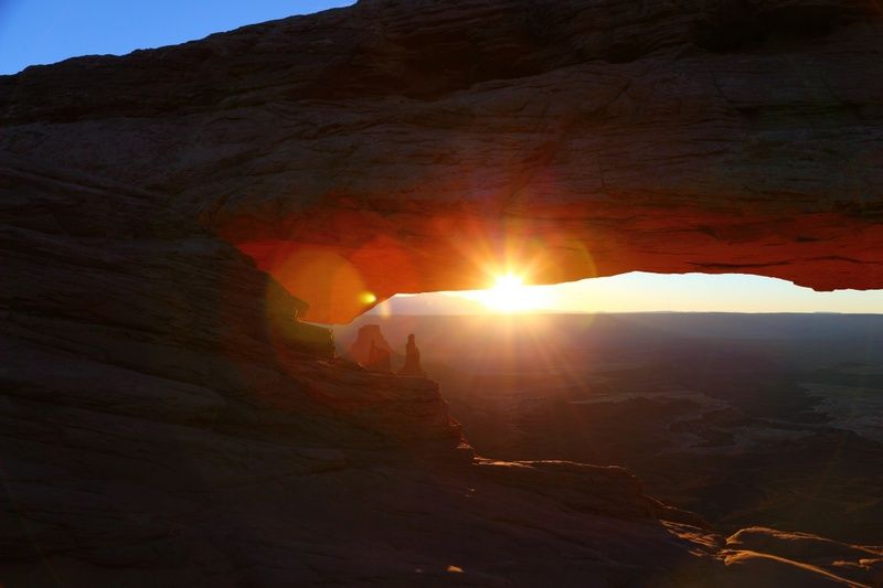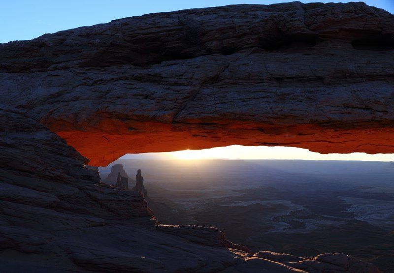 Le clairon sonne à 5h30, nous allons profiter du beau temps pour faire le lever de soleil sur Mesa Arch qui se situe à 35km d'ici. petit déjeuner rapide, toilette encore plus rapide et nous quittons le campground à 6h15, nos voisins doivent être contents, nous avons fait le moins de bruit possible. L'entrée du parc n'est pas gardée à cette heure ci, pas de garde, nous continuons notre route et arrivons au parking, waouh déjà plein de monde, c'est vraiment incroyable, nous filons sur le sentier car l'aube pointe et le soleil ne va pas tarder à se montrer tout là bas sur les Manti La sal Mountains. Nous arrivons au pied de l'arche et ne savons pas où nous allons pouvoir nous installer, il y a une bonne soixantaine de personnes et d'autres arrivent derrière nous. Comme ils sont tous massés au milieu de l'arche, je me mets complètement à droite ce qui va me permettre d'avoir l'arche sur sa longueur et surtout de pouvoir capter les rayons du soleil sur la base de l'arche. Je suis bien sauf que des asiatiques arrivent, un car entier certainement et ils ne manquent pas d'air, faut montrer un peu les dents et tous les photographes présents se plaignent de leurs façons de faire. Pour ma part étant au bord du précipice, ils ne peuvent pas passer de l'autre côté ce qui me laisse relativement tranquille et je peux ainsi profiter du magnifique spectacle qui s'offre à moi. Dès que le soleil pointe sur l'arche, il n'y a que quinze minutes maxi possibles pour faire les photos, après c'est terminé. Je suis comblé par ce spectacle et Françoise aussi, nous plions bagage vers 8h00 avec 100 photos dans la boîte. Nous partons maintenant vers une balade plus difficile et où nous serons seuls, Aztec Butte, ruines indiennes sur un gros mamelon à 3km A/R. Pas d'asiatique ici pour les photos, je suis seuls car il faut faire un peu d'escalade et Françoise préfère rester à m'attendre, elle ne perdra rien car ce n'est pas facile de trouver ces ruines. De retour chez Hugo, nous partons pour un autre point de vue avant que le soleil ne soit trop haut dans le ciel, les couleurs sont encore belles, nous allons à Upheaval Dome, 3km A/R puis nous repartons au Grand View Point pour admirer le spectacle sur White Rim et The Maze. Nous ferons d'autres arrêts sur la route du retour au campground où nous serons vers midi, crevés mais contents de cette matinée à courir. Après-midi repos, bricole dans Hugo, MAJ du site, tri des photos, bref de quoi s'occuper, demain sera un autre jour!