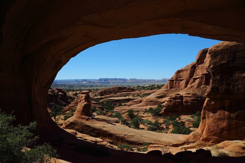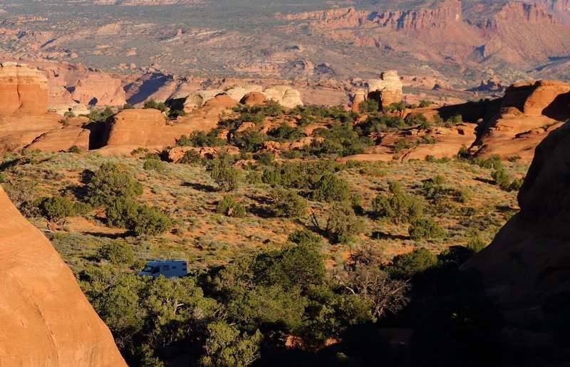Il fait un temps superbe ce matin et pas vraiment froid malgré l'altitude, nous nous préparons tranquillement et serons prêts à partir vers 9h00. Nous prenons la direction de Arches National Park que nous aimons beaucoup pour y être déjà passé une demi-douzaine de fois mais cette fois-ci nous allons faire quelques pistes afin de découvrir les arches inaccessibles en véhicule normal. Nous sommes frappés par la queue qu'il y a à l'entrée, jamais vu cela même en plein été, beaucoup nous disent que c'est une question de climat, très accessible en ce moment avec moins de 30° dans la journée. Toujours est-il que nous sommes perplexes et nous nous posons des questions, allons-nous trouver une place au campground, le seul, qui se situe à Devils Garden, tout au bout du parc? Il est 9h30 quand nous prenons la route, à l'entrée la ranger nous dit que c'est "full", aie, nous y allons tout de même. Dans le parc c'est la grande foule, pas moyen de trouver une place sur les bas côtés là où les arrêts sont autorisés et les parkings sont pleins, fin septembre tout de même et il n'y a pas que des retraités.