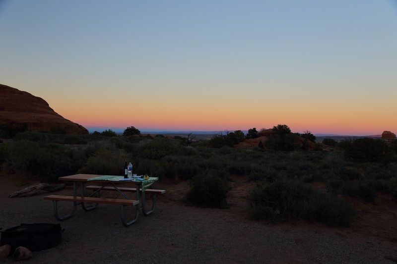 Nous repartons vers 17h30 depuis le campground et nous prenons un sentier superbe qui va nous conduire sur une série d'arches et surtout sur de magnifiques paysages au soleil couchant. Nous serons de retour vers 18h45, fatigués, il est temps que la journée se termine, nous dînons dehors et profitons du spectacle donné par le soleil.