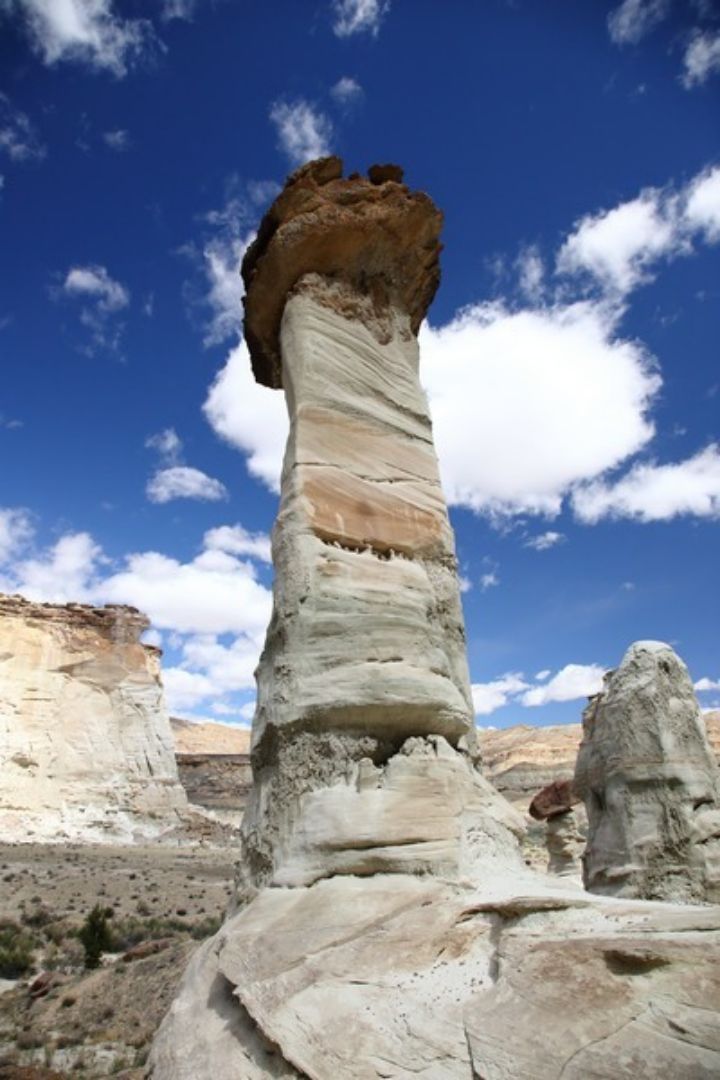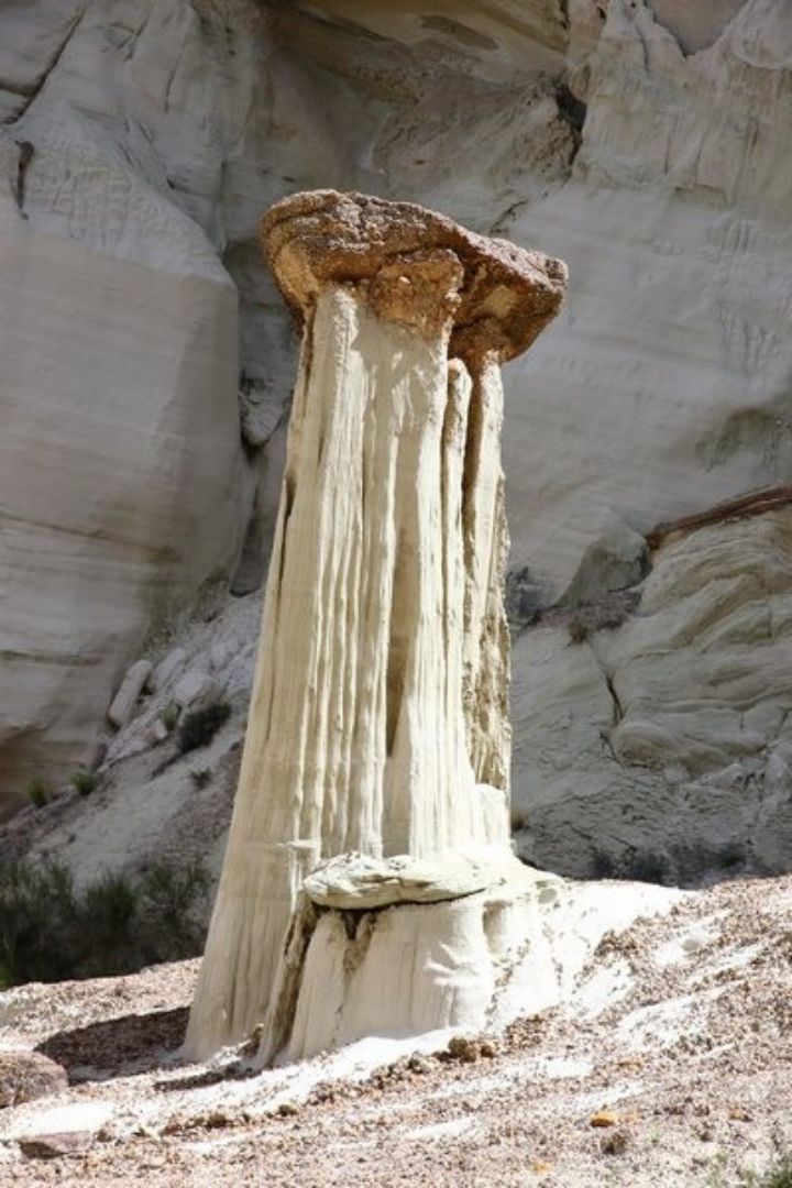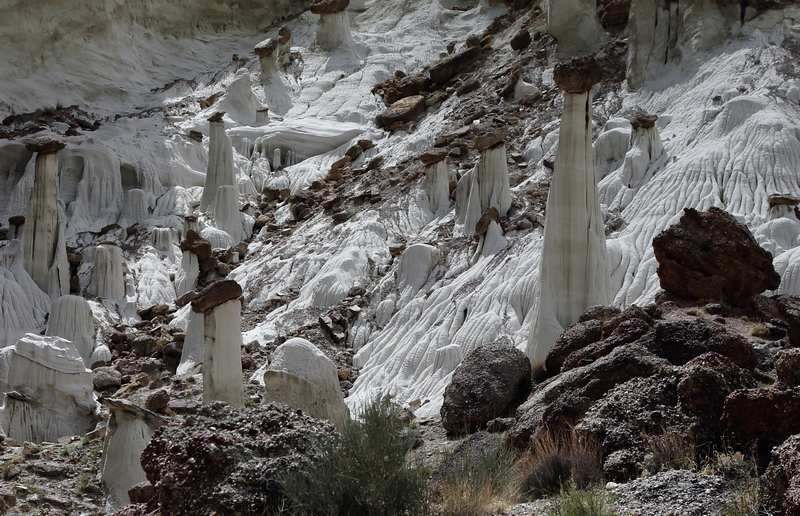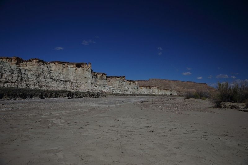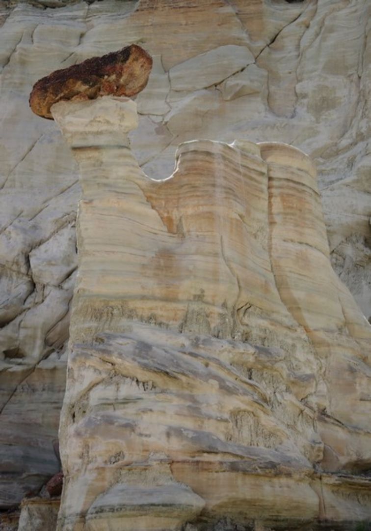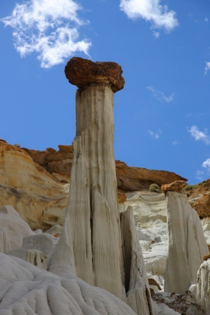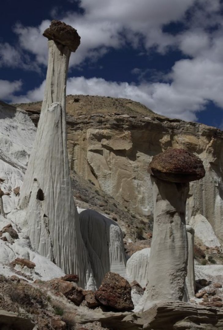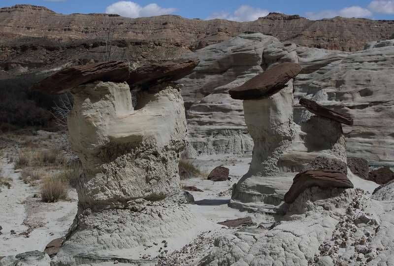 A Big Water nous cherchons et finissons par trouver la BLM 327 qui part juste en face du Visitor Center, la suivons pendant quelques miles et franchissons le wash dans lequel il y a un peu d'eau. Nous laissons nos camions sur le parking et commençons la remontée du wash dont l'humidité ramollie le sable et par endroit nous nous enfonçons. La marche va durer 1h30 et nous sommes au premier groupe de hoodoos, seuls bien évidemment car il semblerait que l'éloignement de ce site en rebute plus d'un. Nous apprécions d'autant et allons marcher deux bonnes heures parmi ces trois groupes de hoodoos dont le plus beau est le dernier. Après une centaine de photos, nous reprenons le chemin inverse pour une arrivée aux camions à 16h00 et après cinq heures de marche sous le soleil, nous sommes très satisfaits de cette belle balade et rentrons au bivouac du soir à la Marina. Nous prenons une bonne douche au bureau d'accueil du camping, un petit peu d'internet pour vérifier les messages et nous nous installons pour la nuit après un bon apéritif pris en commun chez Sylvie et Christian.