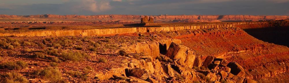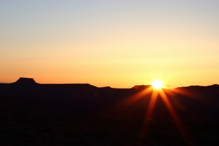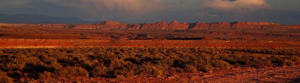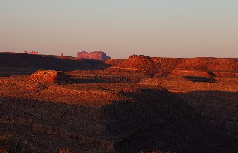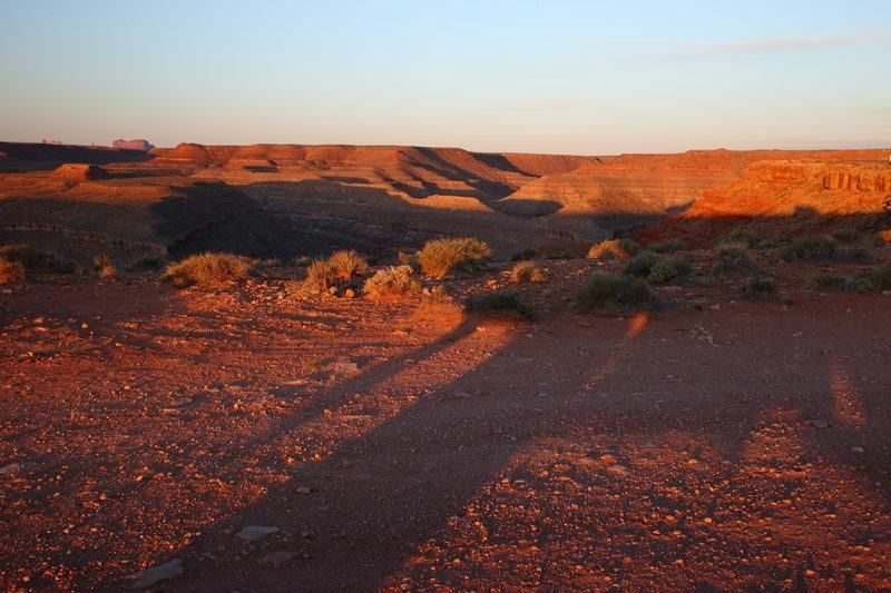 Quel beau lever de soleil nous avons ce matin, c'est l'avantage d'être en altitude avec un horizon dégagé. Nous ne nous lassons pas de ces beaux débuts de journée et je suis vite à faire quelques photos pour profiter des couleurs qui ne vont pas durer longtemps. Le soleil monte très vite et nous voyons les formes décliner en même temps. Au loin les mesas de Monument Valley se colorent elles aussi, puis cinq minutes plus tard c'est terminé, il faudra attendre ce soir pour trouver de nouveau ces couleurs de feu.