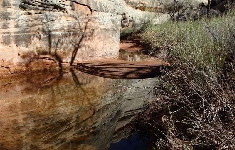4° ce matin mais un ciel d'un bleu rarement vu pour nous, ceci nous annonce une très belle journée. A 9h00 nous sommes prêts à partir au départ de la balade du jour et cinq minutes plus tard nous attaquons la descente vers le premier bridge qui se nomme Sipapu et qui est le second plus grand après le Rainbow Bridge sur le Lake Powell. La descente fait 1.100km et il y a quelques échelles de bois à passer mais le tout dans une grande sécurité. Il y a un peu d'eau dans le wash mais les arbres n'ont pas encore ouvert leurs bourgeons et cela manque un peu de verdure.