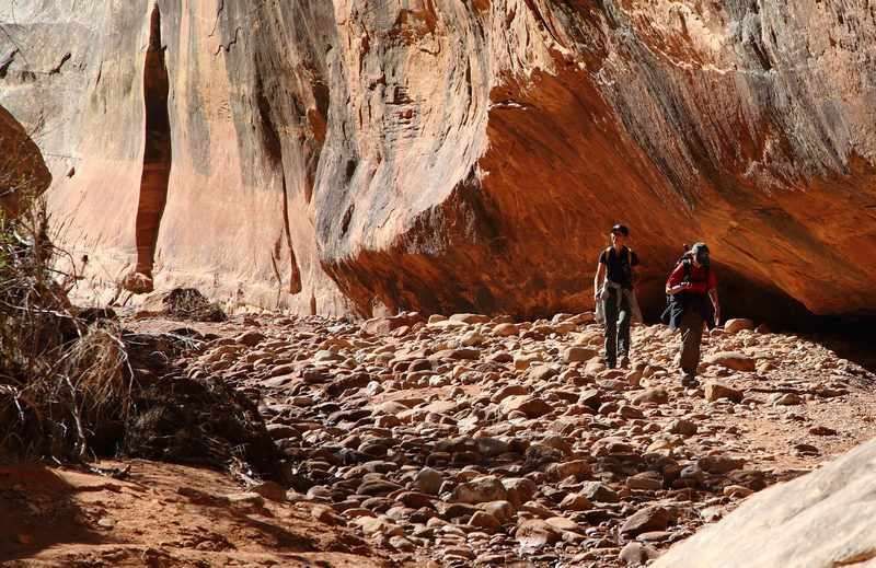 Nous allons suivre ce canyon en passant par des ruines des indiens Hopis puis nous passerons sous le second bridge, Kachina après 8km de randonnée dans le fon du canyon. Nous déjeunons sur une terrasse face au bridge et nous reprenons notre chemin peu après. La couleur des roches est magnifique et ce grand soleil nous permet d'avoir une très bonne lumière pour les photos. L'accès au dernier bridge sera moins facile car il faut chercher son chemin parmi les hautes branches qui poussent dans le canyon et les éboulements mais nous parviendrons tout de même au bout de ce canyon après 6h00 de marche. Il nous reste à faire les derniers 3.2km pour rejoindre Hugo au point de départ de ce matin, nous y serons 1h00 plus tard, il fait chaud et nous buvons beaucoup. Fourbus par cette balade mais très satisfaits d'avoir réussi, nous allons passer la soirée tranquille à faire le tri des photos, demain sera une journée de transition entre courses, plein d'eau pour Hugo et trouver un endroit où dormir demain soir.