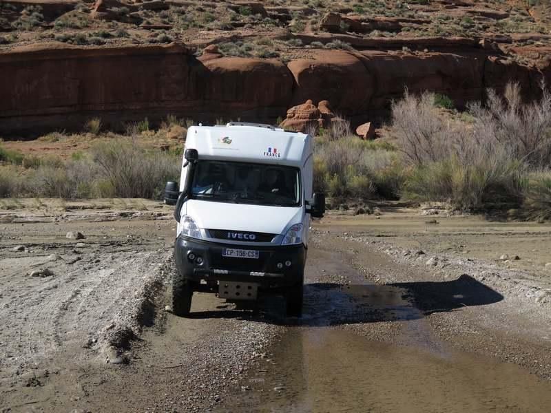 La montée est réputé dangereuse et déconseillée au plus de cinq tonnes, bon nous verrons bien, il faut tenter et nous verrons s'il y a lieu de faire demi tour. Au pied de la paroi nous ne voyons pas la route, en fait elle devient piste sur toute la montée, nous dégageons beaucoup de poussière mais très vite nous sommes au sommet et sans avoir rencontré de problème majeur, tout va bien nous pouvons continuer notre route vers les "Natural Bridges Monuments" que nous atteignons vers 11h30. Un petit tour au Visitor Center et nous partons vite au campground car il ne reste que deux places disponibles et nous les prenons de suite. Nous déjeunons et partons tous les quatre dans Hugo pour faire le "loop" qui conduit aux différents points de vue sur les "bridges". Nous en profitons pour faire quelques sentiers afin d'avoir de meilleurs points de vue. Nous décidons de faire une randonnée de 14km demain en partant du Sipapu Bridge jusqu'au Owachomo Bridge en suivant le wash (le torrent qui passe en bas). Nous terminons notre tour très satisfaits de notre journée et passons la soirée à revoir les photos du jour. Demain va être une dure journée mais comme cela sera un autre jour, ne nous en faisons pas à l'avance!