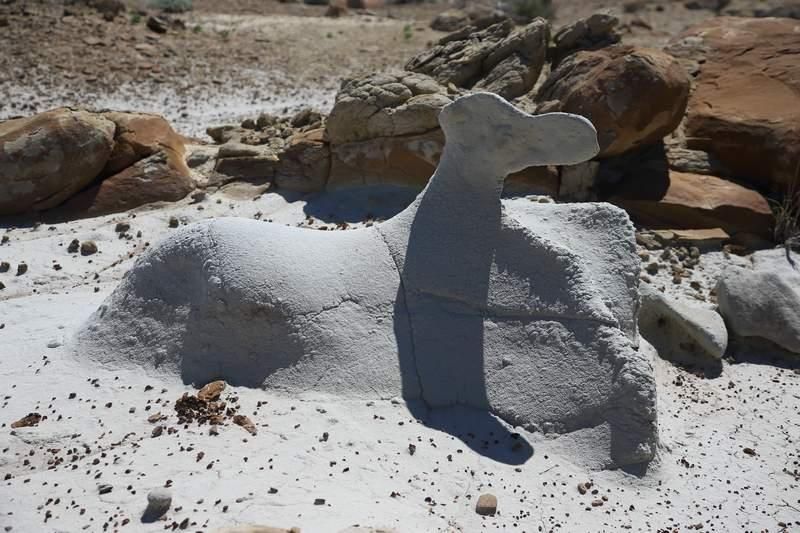 Après avoir regardé les cartes hier soir, nous décidons de partir ce matin vers les "Bisti Badlands" distant de 180km depuis Chelly. Nous sortons du parc par le nord et rejoignons rapidement une route qui nous fait passer par la montagne et qui nous change des paysages désertiques que nous avons depuis longtemps. Nous traversons donc les "Chuska Mountains" et passons au col de "Washington Pass". Mais très vite nous voici replongé dans la "pampa" et de nouveau dans les déserts. Nous arrivons à "Bisti" vers dix heures et partons tout de suite en randonnée pour voir ces fameux rochers aux formes où l'imaginaire travaille dur, cela va du sea lion au Sphinx en passant par toutes formes identifiables selon le regard de chacun. Nous passerons deux heures à nous balader parmi ces rochers et sachant qu'il faut 1h00 pour les approcher nous reviendrons vers 14h00 chez Hugo. Comme il est tôt nous partons vers le sud et allons aller bivouaquer en altitude et en pleine forêt dans le "Cibola National Forest". C'est très joli et nous sommes à 2400 mètres d'altitude, le fond de l'air est frais et avec le vent, même très frais! En fin de compte nous trouvons un campground du "National Forest" où nous nous installons pour 5$, il y a deux autres véhicules à 200 mètres de nous, calme assuré. Comme la journée à été fatigante entre les kilomètres avalés et la randonnée, nous dînons et allons nous coucher très tôt, demain il fera jour et nous irons vers l'ouest en direction d'autres petits parcs tous aussi sympathiques que ceux que nous venons de faire.