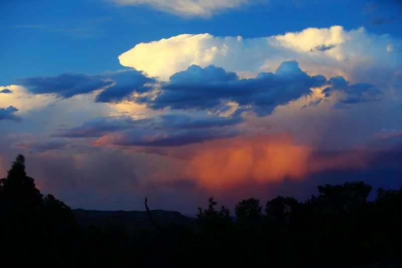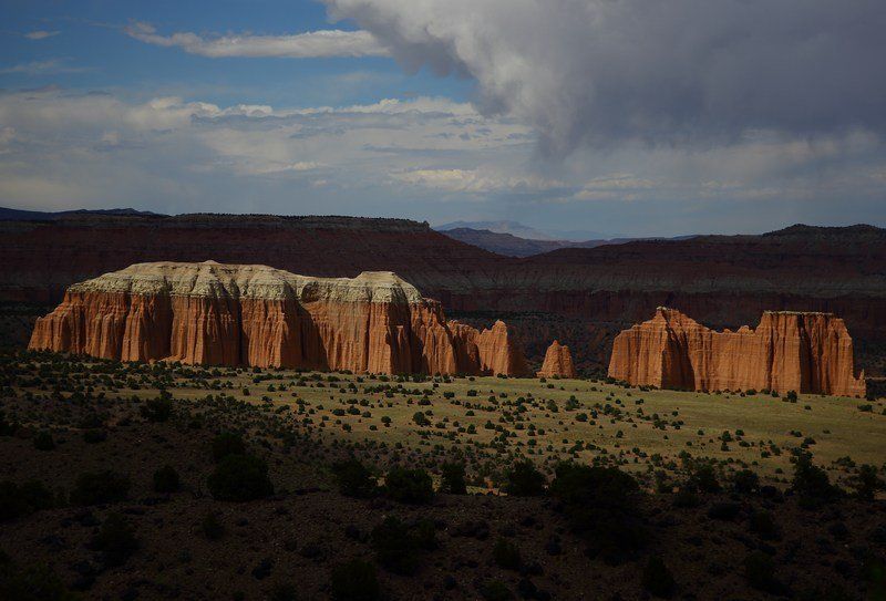 Nous retrouvons Pascale et Alain devant le "Visitor Center" et allons vers le parking du "Hickman Bridge Trail" et partons faire cette petite randonnée de 3.2km A/R. Il fait beau malgré quelques nuages bien noirs mais assez loin, la balade sera rapide et les photos assez sympas. De retour aux véhicules, nous partons rejoindre la piste de "Cathedral Valley", passons le gué de la "Fremont River" et entamons la piste tout de suite après. Les nuages au loin se rapprochent mais nous insistons, passons les "Bentonite Hills" magnifiques et continuons notre route accompagnés des nuages noirs. Nous ferons d'autres stops pour les photos sur différents points de vues, recevrons quelques averses en cours de route et atteindrons le campground qui se situe aux alentours de 50km depuis le départ de la piste. Nous nous installons, prenons notre déjeuner et les orages claquent autour de nous, nous essuyons de bonnes averses et cela continue au moment où je frappe ces lignes. Nous sommes cernés par les orages et commençons à nous poser des questions pour demain car la piste risque d'être impassable dans les deux sens, nous verrons bien demain. Le campground est situé sur les hauteurs si bien que nous avons un très bon point de vue sur les "Cathedral" en bas dans la vallée, c'est superbe et nous passerons à côté demain si tout va bien.