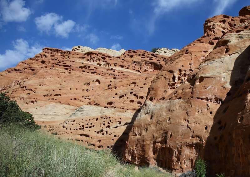 Compte tenu des hautes températures que nous subissons depuis un bon moment, nous avons décidé de partir faire nos balades tôt le matin et de rentrer vers midi au frais chez Hugo. Ce matin nous partons vers le "Cohab Canyon" qui commence par une montée assez raide mais partiellement dans l'ombre ce qui nous aide bien. Très vite nous entrons dans le canyon qui descend en pente douce jusque la "Hwy 24". Nous irons au bout et reviendrons sur nos pas en faisant de nombreux stops photos. Nous prenons une variante de chemin qui va nous conduire sur un beau point de vue de toute la vallée puis nous reprenons le sentier qui va nous ramener au campground un peu avant midi. Il fait maintenant très chaud et nous commençons à bien sentir la fatigue certainement plus forte à cause des températures. Cette après-midi cela sera repos à l'ombre d'Hugo ou des arbres qui nous environnent, lecture, MAJ du site et tri des photos en attendant de refaire une petite balade en fin de soirée.