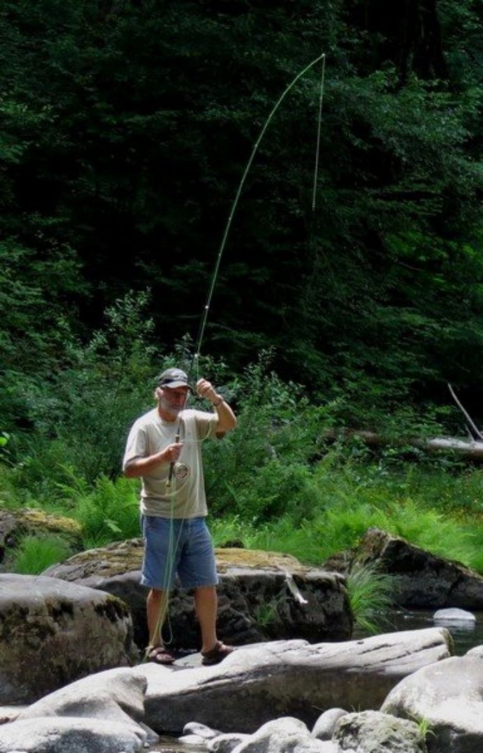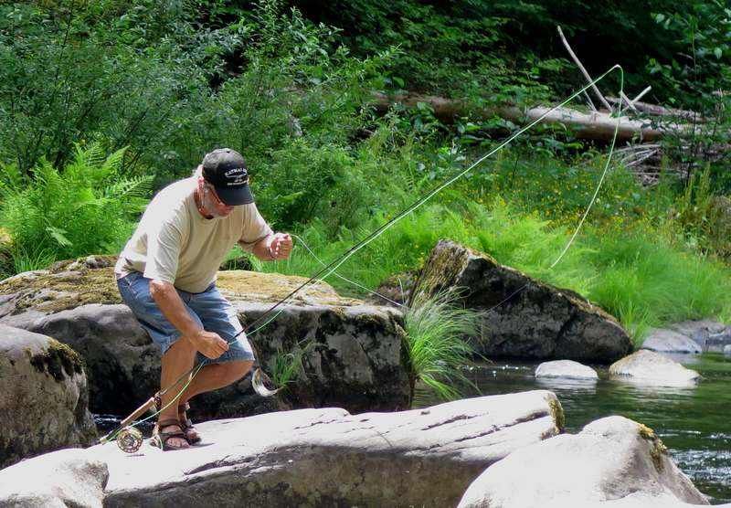 Debout à 8h00, waouh on devient vieux et en plus ce sont les oiseaux qui nous ont réveillés comme quoi lorsqu'il n'y a pas de bruit nous dormons bien! Nous reprenons la route pour une petite centaine de kilomètres en direction de "Fall Creek" où nous sommes passés il y a dix jours et où je me suis bien amusé à pêcher. Nous faisons une halte ravitaillement à "Springfield" et trouvons du WiFi chez MacDo, comme d'habitude, c'est le seul service pour lequel nous sommes clients! Nous sommes vendredi et il nous faut trouver un site pour trois nuits car le W-E c'est de la folie, il y a du monde partout et nous avons la chance de retrouver le même emplacement que la dernière fois autrement c'est complet sur les quatre campgrounds des parcs du coin. Nous déjeunons tranquillement et je prépare le matériel de pêche, Françoise me suit et elle va rester un long moment assise au bord du torrent sous un chaud soleil. Elle me quitte juste au moment où j'attrape un petit "silver salmon", il fait deux centimètres de plus que la taille requise aussi je le garde. Ensuite je vais relâcher trois petites truites et je rentre au camion car j'ai chaud et soif, je reviendrais en soirée. Vers 17h00 je retourne au bord de la rivière mais l'emplacement où je me mets d'habitude est pris, je vais donc un peu plus loin mais sans grand résultat, disons qu'il fait trop chaud c'est une façon de justifier la mauvaise pêche!!! Nous dînons dehors à l'ombre des grands sapins mais nous regrettons vite car les passants viennent nous parler d'Hugo et faire des photos, grrrr, pas moyen d'être tranquilles sur le site où nous sommes. Nous terminons vite et rentrons nous cacher, c'est le mot, pour avoir enfin un peu de calme et aller nous coucher, demain il fera jour.