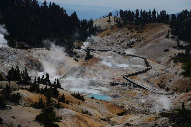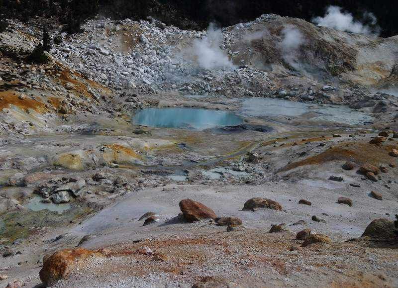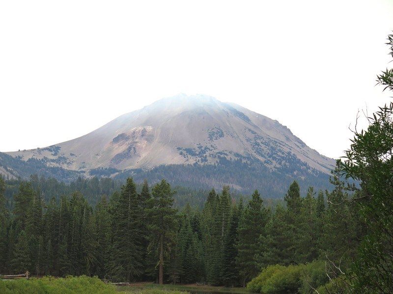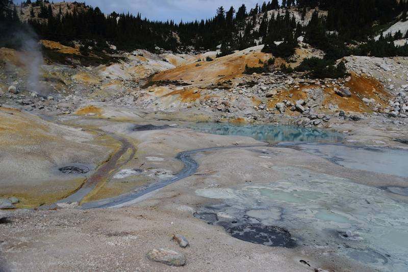 La nuit fût longue et pas terrible mais ce matin le soleil est là, enfin disons qu'il ne pleut pas et qu'il fait moins sombre. Nous quittons le lac vers 9h30 et entamons la montée qui va nous conduire au pied du "Mount Lassen", le plus haut volcan de la région. Nous laissons Hugo sur un parking et partons faire une balade de deux heures, nous allons voir des "fumerolles", une zone de hautes températures avec des geysers. Il y a quelques rayons de soleil mais ils sont bien pales, le principal c'est que nous puissions en profiter. Cette balade nous fait du bien, en chemin nous croisons des français mais pas d'échange avec eux, nous supposons que comme nous ils ont du être surpris d'entendre leur langue dans ce parc qui n'est pas un grand centre touristique pour les européens.