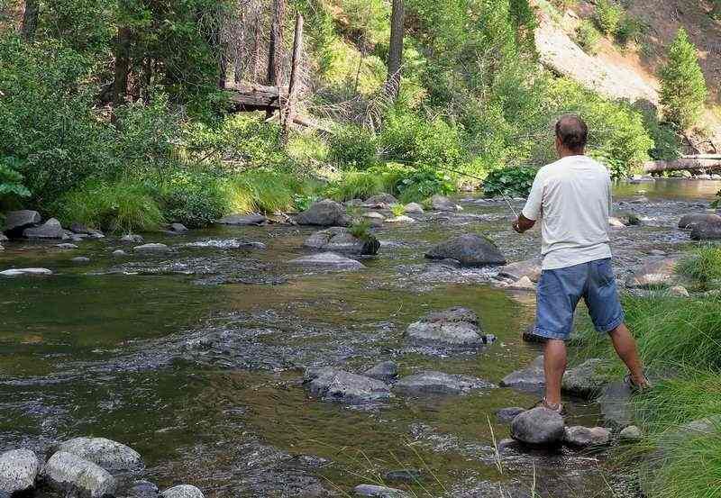 Nous déjeunons sous le gros séquoia, bien à l'ombre, nous sommes comme des coqs en pâte, nous nous plongeons dans nos tablettes de lecture durant plus de deux heures et ensuite je me décide à partir pêcher. Je vais revenir assez rapidement car j'ai quatre truites pour ce soir et j'en ai relâché une bonne quantité, je ne sais pas combien, n'ayant pas compté. Je repars et Françoise veut m'accompagner pour faire quelques photos, nous prenons un sentier qui nous fait découvrir de beaux endroits de pêche, je vais relâcher encore de belles pièces, quel bel après midi. Fin de journée à préparer le BBQ pour cuire les truites et petit apéritif bien à l'ombre et tout près du feu, je n'ai pas froid!