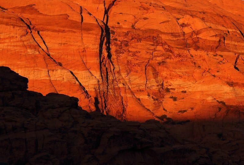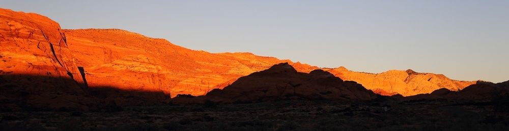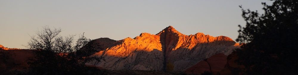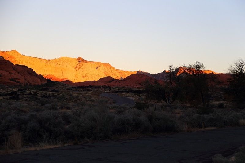 Nous nous levons avec le soleil après une nuit presque correcte, l'effet du décalage commence à s'estomper. Dehors la montagne est rouge, je sors pour faire quelques clichés de ces moments magiques. Nous quittons le Snow Canyon à 9h30 et partons faire les dernières courses avant de filer vers Kanab distant de 150km et où nous serons à midi. Nous retrouvons nos amis comme convenu et sommes vraiment heureux tous les quatre de nous revoir, cela faisait six mois que nous les avions quittés à Moab. Sylvie nous a préparé un succulent repas et nous allons papoter dans Cisco jusqu'à la tombée de la nuit vers 16h30. Nous rejoignons HugoII à ce moment et allons finir la journée sur le web car nous avons une petite connexion à la station Texaco où nous nous sommes posés pour la nuit. Nous y sommes que nous quatre en ces périodes creuses pour le tourisme et tout va bien. Nous réussissons à tenir jusque 20h30 et partons nous coucher à ce moment, dehors la température est de 1.5°, il va faire froid demain matin!