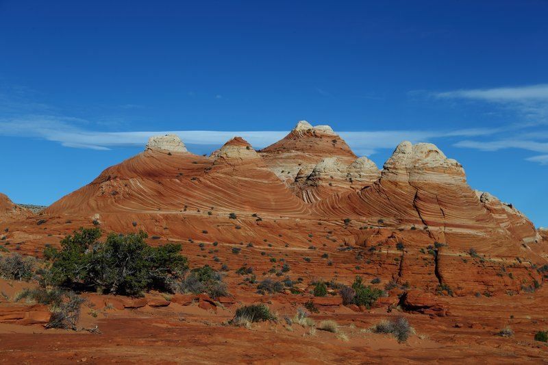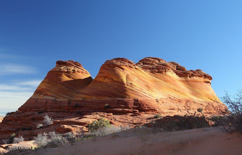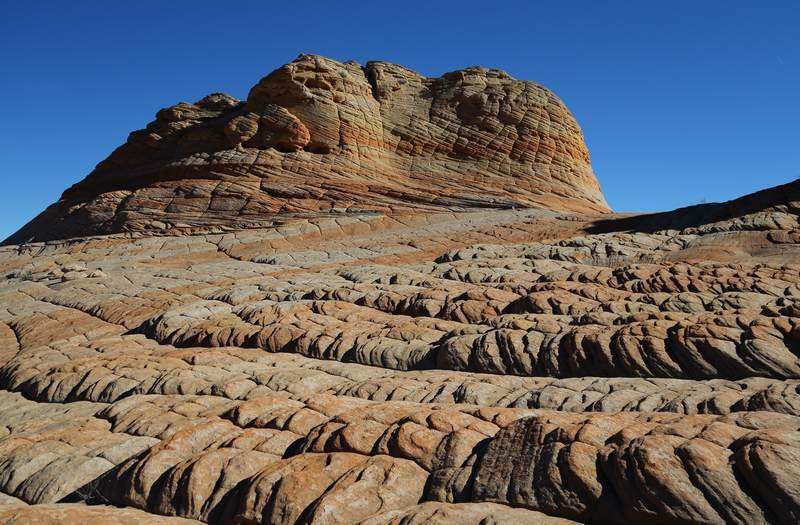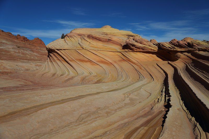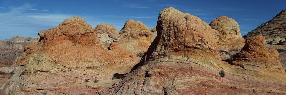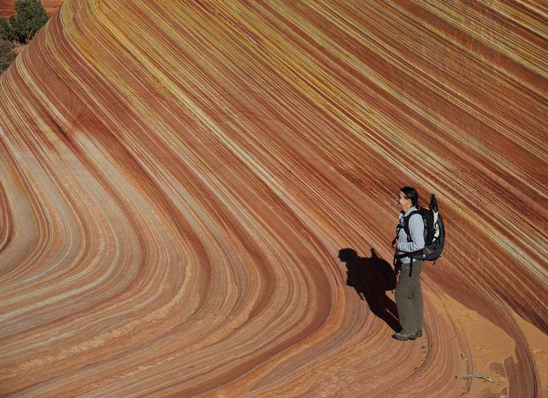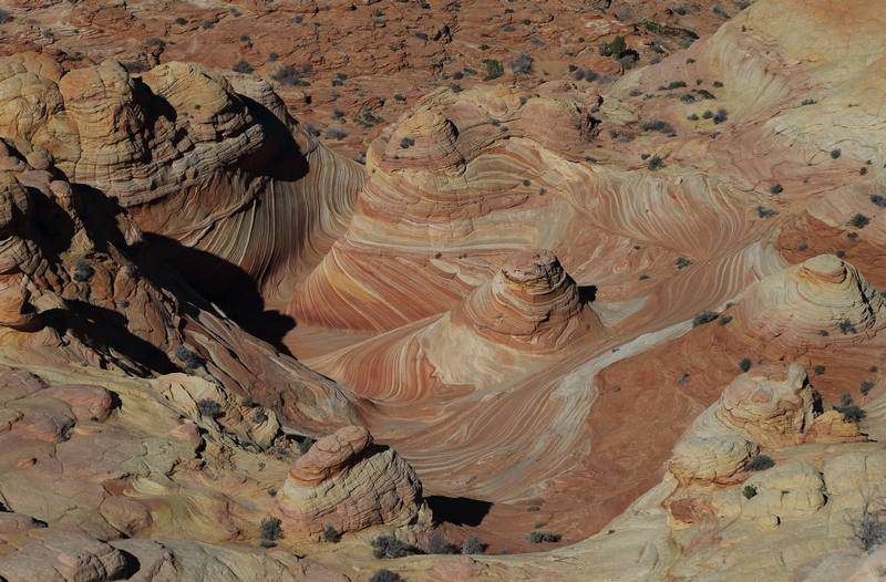 Le soleil tarde à venir pour éclairer "The Wave", nous attendons bien sagement qu'il se montre, il y a un autre randonneur qui lui a été tiré sur la loterie internet, trois mois avant. Des vingt personnes qui devraient être là, seules onze seront présentes. Là ce n'est pas normal car les absents prennent la place de ceux qui seraient bien venus. Par contre nous ne sommes pas enquiquinés pour faire nos photos. Nous allons parcourir les lieux pendant quatre heures et faire des découvertes sur le haut de "The Wave" avec Christian, en allant sous une arche et en direction d'autres arches et de dunes de sable. Nous retrouvons Sylvie et Françoise après avoir redescendu en désescalade ces rochers bien pentus. Maintenant il faut songer au retour avant la nuit car il est 14h00 et nous devons être rentrés avant 16h00. Il fait chaud sur le parcours du retour, c'est très agréable et nous ne mettrons que une heure trente en marchant tranquillement dans ces lieux magnifiques. Nous apprécions le retour dans Hugo et au campground, une bonne douche, un regard rapide sur les photos et la soirée sera vite passée. Nous sommes fatigués et ivres de ces images qui défilent devant nos yeux, de beaux rêves pour cette nuit.