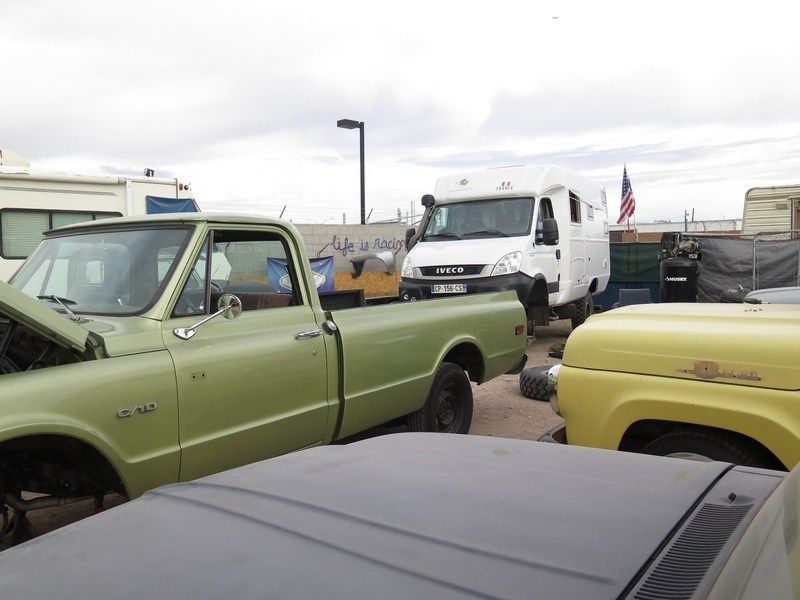 Réveillés à 3h00 du matin, nous restons malgré tout couchés jusque 6h00 et ne pouvant plus tenir nous nous préparons, allons au Paris prendre un petit déjeuner sous forme de buffet (toujours aussi agréable) et revenons à notre chambre pour faire le "chek out". Un taxi va nous conduire au "storage" où se trouve HugoII, nous le récupérons vers 10h00, il démarre au premier coup de clé, super il est en forme, pas nous. Avant de quitter le "storage", je passe un appel à Oliver Revolon de MCWA dont nous avions pu voir un reportage sur TF1 en octobre dernier. Il restaure de bien belles vieilles voitures américaines qui sont ensuite revendues soit en France soit sur le marché américain. Nous nous rendons chez lui et allons savourer une bien belle rencontre même s'il ne peut nous aider dans nos problèmes mécaniques. Un début de voyage qui commence très bien et un agréable moment passé avec Oliver, merci encore pour ton aide. Nous allons ensuite vers notre RV Park favoris à Las Vegas, le Hitchin Post, nous retenons pour trois nuits car il va nous falloir changer les disques de freins et le garage que nous avons contacté nous parle de faire les travaux sur deux jours. Donc nos retrouvailles avec Sylvie et Christian seront pour dimanche au mieux.