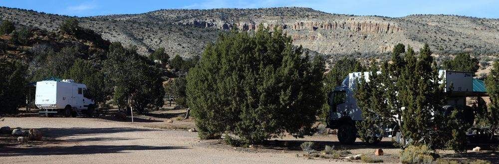 Maintenant il va falloir trouver quoi faire jusque demain matin, nous décidons de faire une randonnée sur les hauteurs de Kanab. Cette balade va s'avérer très sympa et en plus au soleil qui commence à bien chauffer, c'est bon pour nos panneaux solaires. Nous reviendrons vers 13h00 aux camions, déjeunons et ensuite nous partons faire quelques emplettes au quincaillier du coin car j'ai besoin de sangle pour le pneu qui a trouvé sa place sur le toit. Merci Christian pour l'aide car seul je n'y serais pas arrivé, 40kgs à bout de bras c'est difficile.