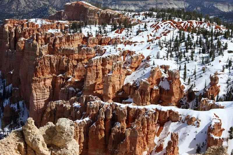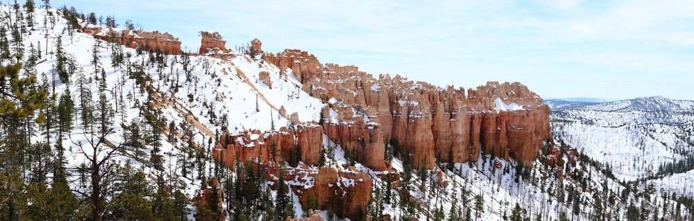 Nous traînons un peu ce matin et profitons des premiers rayons de soleil avant de partir vers Bryce Canyon où nous espérons trouver la neige. Nous quittons Zion vers 9h30 et filons vers la sortie du parc non sans faire quelques photos de ces belles parois. La sortie des tunnels est toujours spectaculaire et malgré une quinzaine de passages ici nous sommes toujours émerveillés pas ces paysages de roches aux couleurs superbes. Nous n'avons que 120km à faire ce matin mais nous allons prendre notre temps si bien que nous arrivons sur Bryce vers midi. Nous passons le contrôle d'entrée et faisons tout de suite le stop au campground du parc car il y a du monde et une petite partie seulement est ouverte. Nous retenons un des rares sites restant et partons faire les points de vue de ce parc extraordinaire. Il y a de la neige partout, c'est magnifique et le soleil rend ces paysages encore plus beaux, un vieux rêve se réalise pour nous, voir Bryce sous la neige, nous sommes servis.