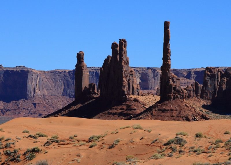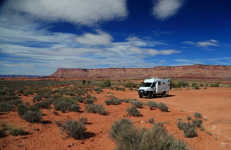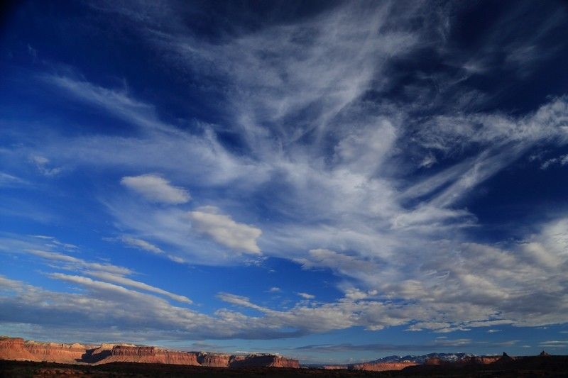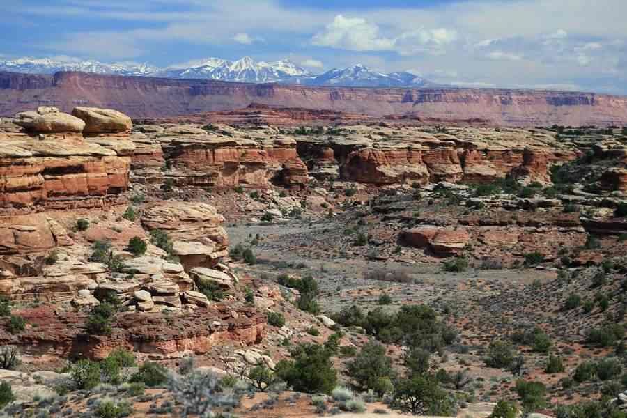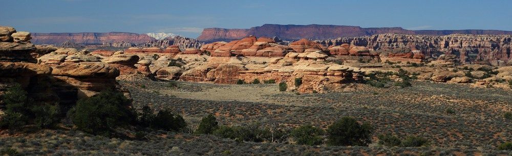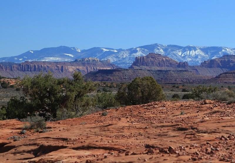 Décision est prise d'aller sur Moab ce matin pour me trouver un filtre polarisant et ensuite nous reviendrons sur les Needles dans Canyonlands National Park. Nous quittons le Goulding's Lodge assez tôt et longeons les "mesa" de Monument Valley, stop photos obligatoire. Au loin les La Sal Mountains semblent bien enneigées, les différentes teintes rendent le paysage très beau. Nous serons sur Moab vers midi et arrivons facilement au magasin photo où je trouve mon bonheur. Nous déjeunons sur le parking de la "laundry" où nous avons nos habitudes ici et profitons du WiFi car cela va être terminé pour un moment avant d'en retrouver.