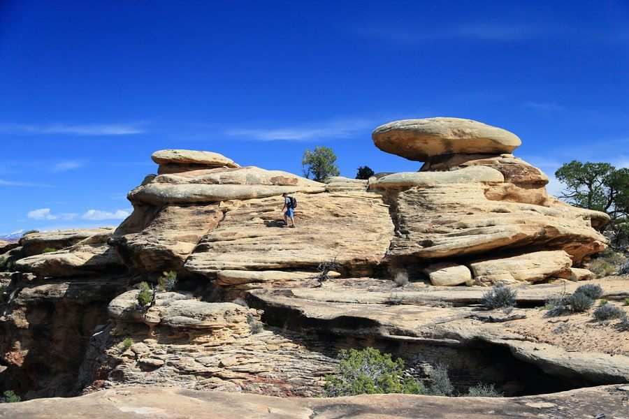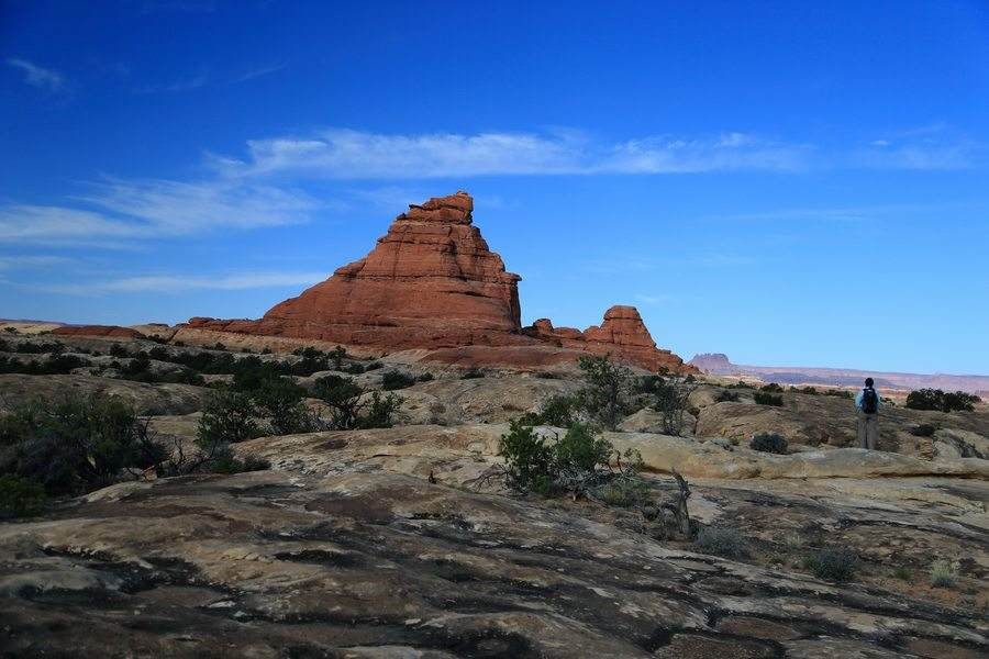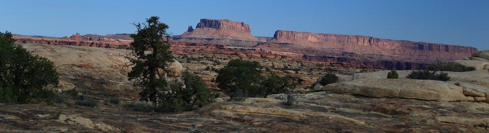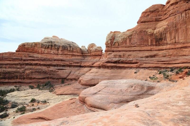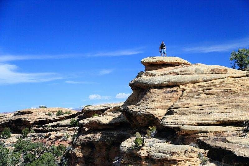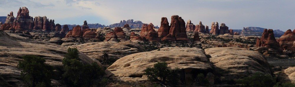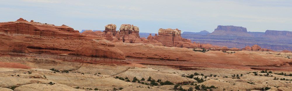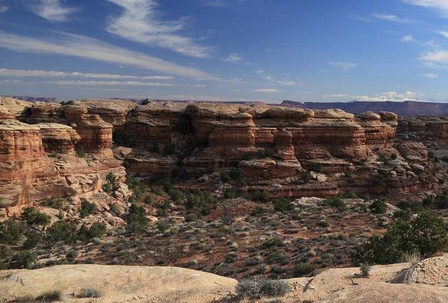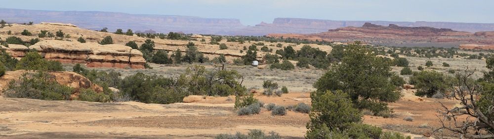 Ce n'est pas le grand beau ce matin mais c'est mieux qu'hier aussi nous nous préparons en vu de notre grande randonnée. Nous quittons notre emplacement pour nous rendre au point de départ du trail sur la piste de Elephant Hill et malheureusement nous constatons qu'elle est fermée. Déception, nous décidons de partir faire une autre longue randonnée de 16km "Confluence Overlook" qui nous permettra de voir le Colorado et la Greene River. Nous sommes au départ du trail à 8h45 et commençons cette difficile balade non seulement elle est longue mais en plus elle ne fait que monter et descendre. Il fait frais dans les canyons que nous traversons et sur le plateau mais quelle belle vue nous avons sur le "Chesler Park" et les Needles. Nous arrivons au point de vue à 11h30 et redescendons nous mettre à l'abri du vent pour manger un peu. Le retour sera plus difficile car non seulement la fatigue commence à se faire sentir mais les passages en escalade sont nombreux et ma petite femme n'aime pas trop, je l'aide bien évidemment à surmonter ces difficultés. Finalement nous serons de retour au pied d'Hugo à 14h45 soit six heures pour faire les 16km/AR, pas mal pour des vieux!