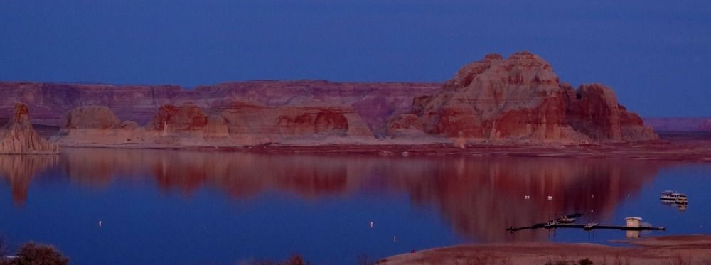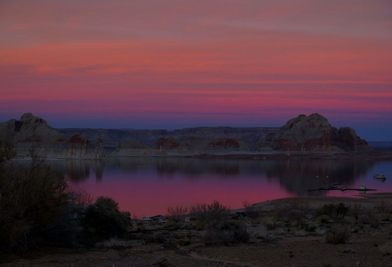 Ensuite direction la Marina de Page où nous bivouaquerons sur le parking, seuls face au lac, nous y avons nos habitudes maintenant et nous allons assister à un beau coucher de soleil avec un ciel voilé et tout rose, reflets superbes sur le lac. Le lit nous attire et extinction des feux à 21h30, demain sera un autre jour.