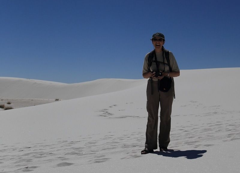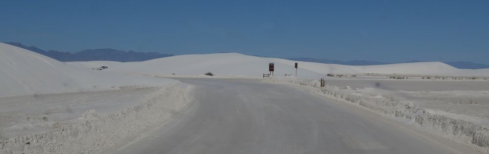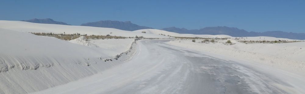 Le soleil chauffe vite ce matin, nous nous préparons et prenons la route vers 8h30 en direction de White Sand National Monument. Nous y arrivons vers 11h00, la plus mauvaise heure pour les photos, la soirée serait bien meilleure. Nous allons jusqu'au bout de la route et laissons Hugo sur un parking puis nous empruntons un sentier, en fait nous suivons des traces dans ce gypse tout blanc. On pourrait croire à de la neige mais ce gypse vient des montagnes environnantes et recouvre 715km carrés de désert ce qui représente la plus grande dune de gypse au monde. La pluie et la neige qui tombent sur les montagnes vont dissoudre le gypse, le séparer des pierres et le déposer dans le bassin de Tularosa.