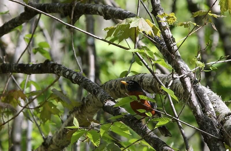 Il fait encore grand beau ce matin, nous prenons la direction du "Parc de la Jacques Cartier" à environs 45km de Québec. Nous y serons vers 11h00 et nous nous rendons directement au centre d'accueil pour notre permis de camper. Nous nous installons, prenons notre déjeuner puis en tout début d'après midi nous partons faire une randonnée de 3h au bord de la rivière Jacques Cartier. C'est très sympa et nous découvrons de petites montagnes bien boisées, une superbe rivière où j'aimerais bien pêcher et en plus nous sommes seuls ce qui est un plus pour la faune. Mis à part quelques oiseaux, nous ne verrons pas autre chose, ici c'est surtout en soirée et le matin tôt que la faune se fait observer. Au retour nous nous posons afin de boire un peu d'eau et une paruline à calotte noire vient nous faire la causette à distance respectable, elle est magnifique.