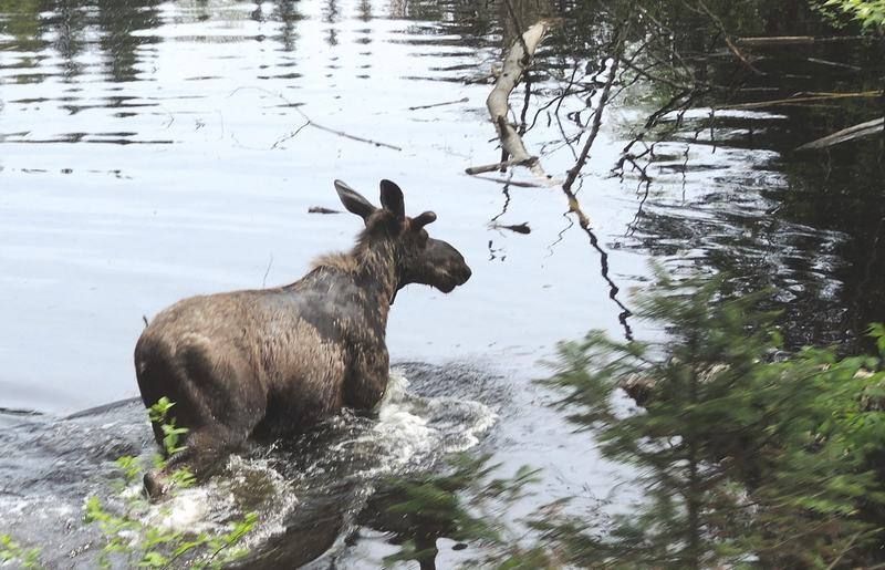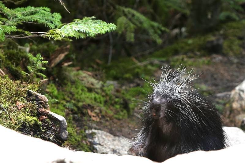 En cours de route nous apercevons un orignal dans une mare, Françoise le shoot avec son petit Nikon, il part vite fait, deux animaux en quinze minutes, la journée commence bien. Nous laissons Hugo au parking et commençons ce qui sera une longue montée de deux heures jusqu'au second belvédère. Le sentier serpente en sous bois puis monte en raides lacets, nous arrivons au bout d'une heure au premier point de vue, c'est beau, dommage que le ciel soit plombé. Nous continuons notre randonnée et presque au sommet nous tombons nez à nez avec un gros porc-épic qui nous regarde ne sachant pas trop quoi faire. Il se laisse mitrailler et devant notre insistance fait un détour par la forêt, encore une belle rencontre car des comme celui-ci nous n'en avions jamais vus. Arrivée au belvédère nous sommes devant un magnifique spectacle, nous avons la vue sur des dizaines de kilomètres. Nous avalons un rapide casse-croûte et commençons notre descente car nous recevons quelques gouttes alors ne traînons pas. Au détour d'un lacet je vois une masse sombre, c'est un orignal mâle, il nous regarde et avance doucement, il nous laisse le temps de le shooter à notre guise, encore une belle rencontre. Au retour au parking je tombe de nouveau sur un porc-épic qui file se cacher sous une voiture, nous aurons été gâté ce jour. Nous faisons un stop au centre d'accueil avant de regagner le camping pour essayer d'avoir internet, c'est trop lent, nous relevons nos mails et filons nous reposer.