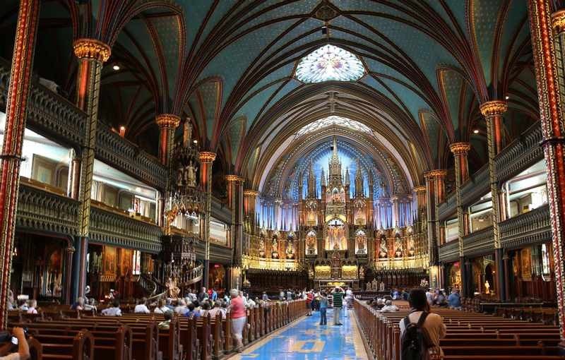 Le métro passe sous le St Laurent et dessert l'Ile Ste Hélène (Parc Jean-Drapeau) puis arrive rapidement à Berri-UQAM, nous pouvons commencer notre visite. Finalement c'est aussi rapide que la visite de Québec, nous allons marcher quatre heures sous le cagnard et cette humidité ambiante qui n'est pas sans nous rappeler la Malaisie, il fait vraiment mauvais. Nous déjeunerons dans un restaurant qui semblait sympa de l'extérieur mais qui ne nous laissera pas un grand souvenir. Nous arpentons le vieux port, le vieux centre, puis nous entrons dans la cathédrale Notre Dame. Que l'on soit croyant ou pas, il faut y entrer pour voir le travail qui a été réalisé par les artisans et autres artistes de l'époque, c'est vraiment très beau. La construction à débuté en 1824 pour se terminer en 1880. L'intérieur est inspiré de la Ste Chapelle de Paris.