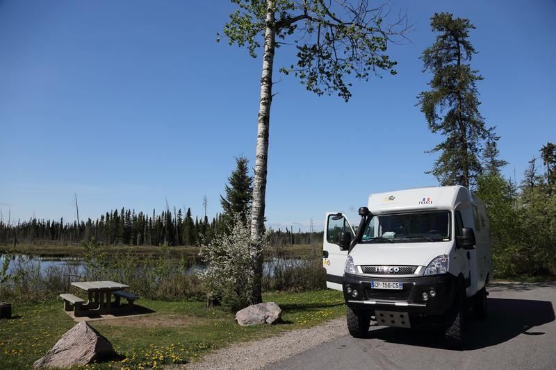 Nous partons assez tôt après avoir étudié la carte avec Bérengère qui nous conseille sur les visites à faire en cours de route, aujourd'hui direction Sudbury, 500Km plus à l'ouest. En fait nous dormirons à Espanola. La route est sympa sans plus, pas grand chose à voir sinon que des forêts et des lacs et cela va être ainsi pendant trois jours encore. Nous dormons au bord d'un lac, au calme avec les bernaches.