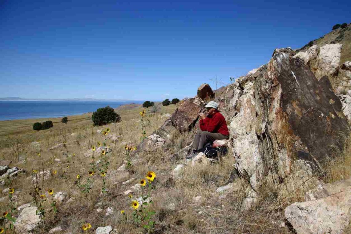 Superbe lever de soleil, le vent qui a été incroyablement fort toute la nuit s'est semble t-il calmé. Petit déjeuner rapide et nous voici parti pour une belle balade de trois heures (10km) pour atteindre un col qui nous permettra d'avoir une grande vue sur le Lake Salé. Nous laissons Hugo III sur un parking et prenons le sentier qui va grimper dur jusqu'au col, la vue est vraiment superbe, et le soleil en prime aide à monter sans se poser de question. Un petit lunch au col et nous voici sur le retour, des bisons paissent un peu partout, nous voyons quelques antilopes mais pas de coyote comme en 2013, dommage.