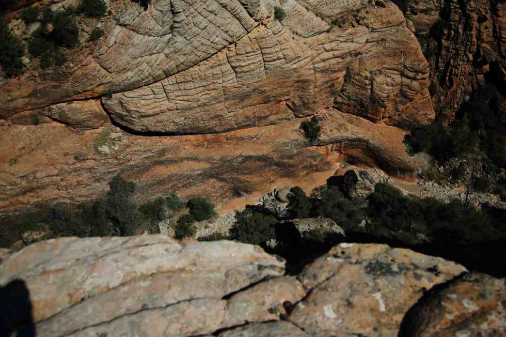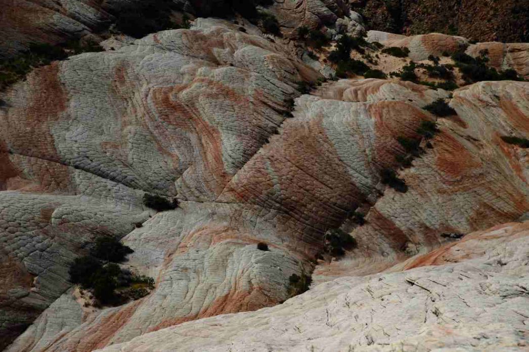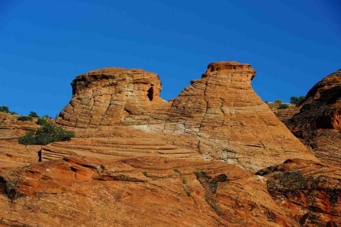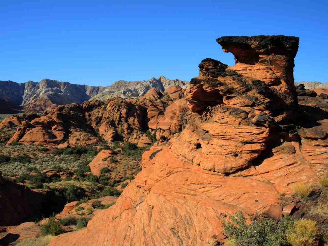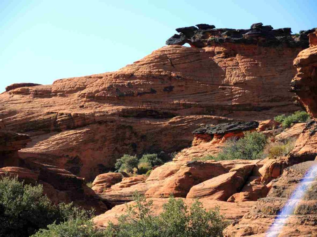 Grand bleu de nouveau ce matin, nous partons vers 9h00 mais faisons un stop au bureau des rangers pour essayer de nous trouver un site pour le W-E. Nous y allons sans espoir car tout est réservé et surprise nous obtenons un site pour deux nuits. Nous partons le cœur léger vers une belle randonnée à Yann Flat. Pour ce faire il va falloir prendre une piste sur 26 km. Elle commence à Leeds au nord de St George et est en parfait état. Elle monte et descend, serpente entre les collines et nous arrivons finalement au parking où rien n'est indiqué, mieux vaut savoir où on va. Cette balade relativement courte monte dans du sable, c'est assez fatiguant pour nos vieux muscles. Nous arrivons au sommet et là , la vue est grandiose sur ces formations toutes en couleurs et ces formes de "brain". Nous allons longer ces dunes pétrifiées et tomber sur un canyon très impressionnant qui plonge de quelques centaines de mètres d'un coup sans prévenir. C'est vraiment très beau. Nous allons rester deux bonnes heures ici, faire le déjeuner et rentrer vers Hugo III sur le coup de 15h00. Au retour nous croiserons plusieurs véhicules qui roulent plus ou moins vite et il faut être vigilant. Fin de journée tranquille au Snow Canyon où il fait encore très chaud.