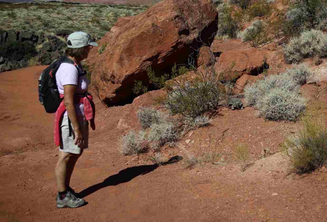 Encore droit à un superbe lever de soleil ce qui nous met en forme pour aller nous faire une randonnée de onze kilomètres dans le Snow State Park. Direction le Johnston canyon depuis le campground, il faut descendre jusque l'entrée du parc et ensuite prendre un sentier qui traverse le champ de lave puis remonte dans le canyon sur du sable. Il fait chaud mais très supportable, nous allons avoir une grosse chance car elles sont rares et pas toujours visibles, nous tombons sur une grosse tortue qui vie ici car il y a un peu d'eau dans le fond du canyon. Elle se déplace sur le sentier, de quoi la prendre tranquillement en photo et la laisser continuer sa route. Nous arrivons au fond du canyon et rebroussons chemin. Nous sommes de retour vers 13h30 au campground et maintenant c'est repos car nous sommes fourbus par la remontée en plein soleil.