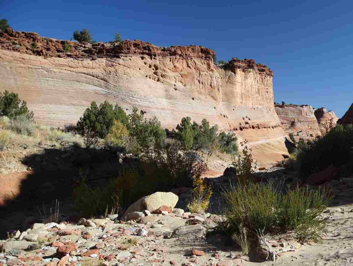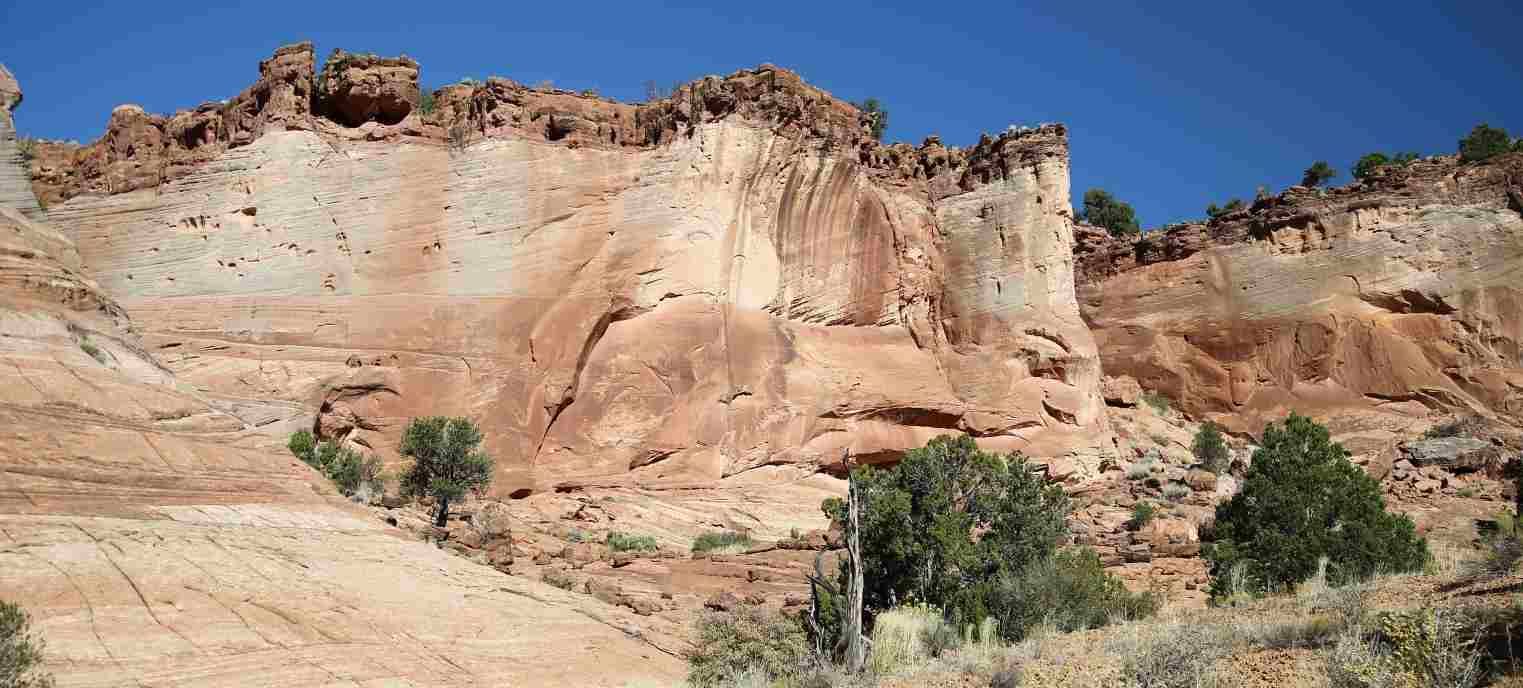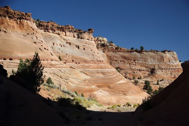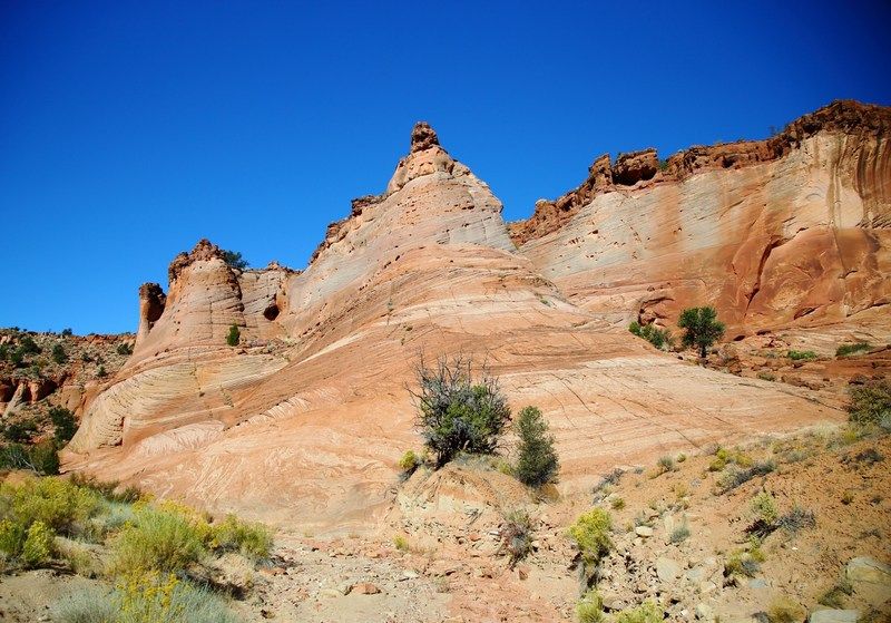 Ce matin nous allons pour la troisième fois en quelques années essayer d'aller dans le Zebra Canyon qui a la mauvaise idée d'être souvent inondé. Nous prenons la HITRR et allons très vite nous poser au parking de départ du trail, il faut aux environs d'une heure et quart pour arriver à l'entrée du slot mais comme nous avançons d'un pas très entraîné depuis deux mois il nous faudra moins d'une heure. Le trail pour y arriver propose en son milieu de traverser des paysages absolument splendides et les photos ne vont pas manquer. Quand nous arrivons à l'entrée du slot un couple en sort et nous dit que l'eau est vraiment très froide et qu'il faut des sandales pour ne pas se faire mal. Ok pour le passage à sec c'est raté mais il y a moins d'eau que quand nous y étions venus aussi nous nous mettons pieds nus et entrons dans l'eau. Waouh quelle surprise, l'eau est absolument glacée, c'est très difficile de supporter , Françoise fait demi tour, je continue mais je n'irai pas très loin car sans sandales impossible de passer les zones rocheuses. Pas grave il faut savoir se contenter des quelques dizaines de mètres dans ce slot et faire demi tour pour ne pas se faire mal aux pieds, ils vont encore servir !