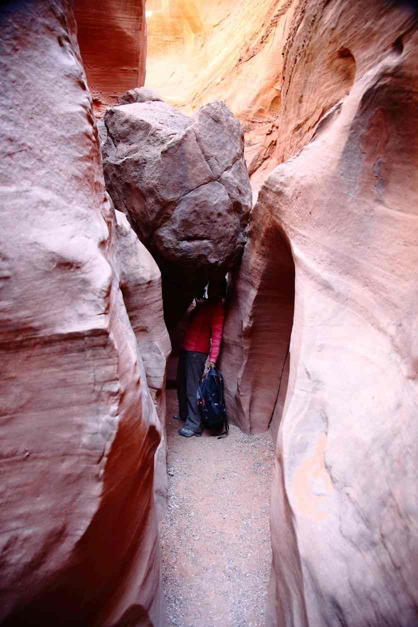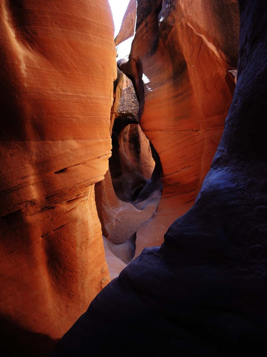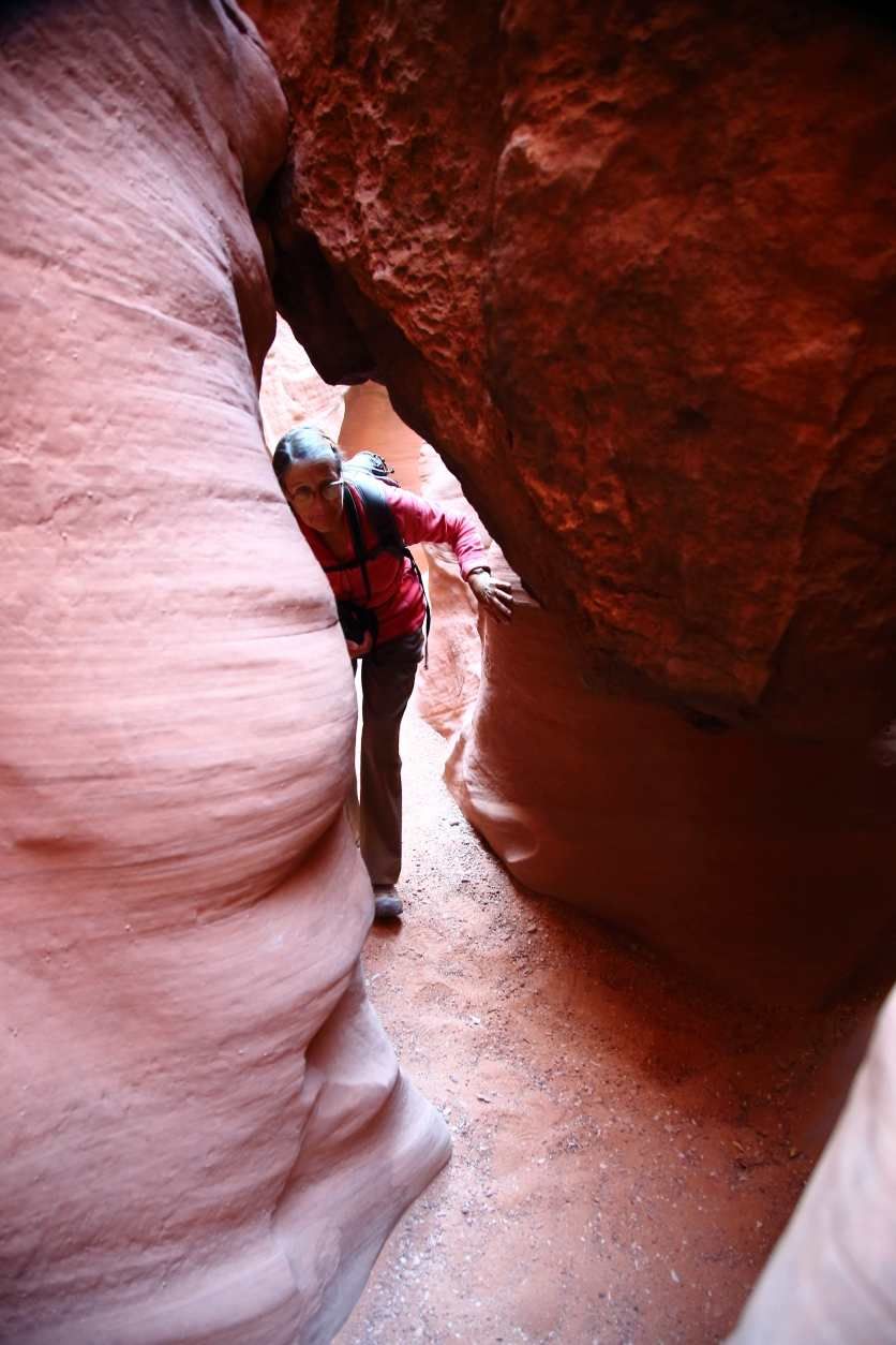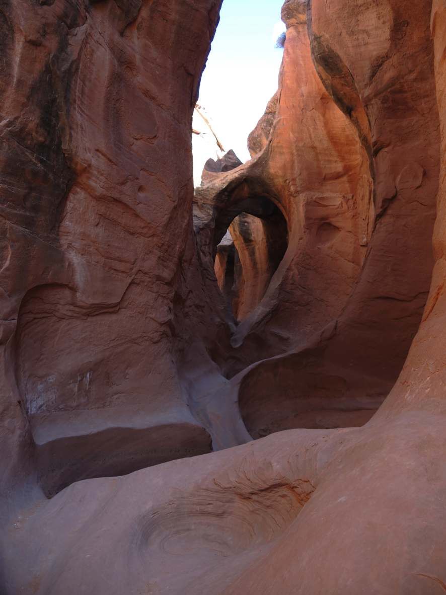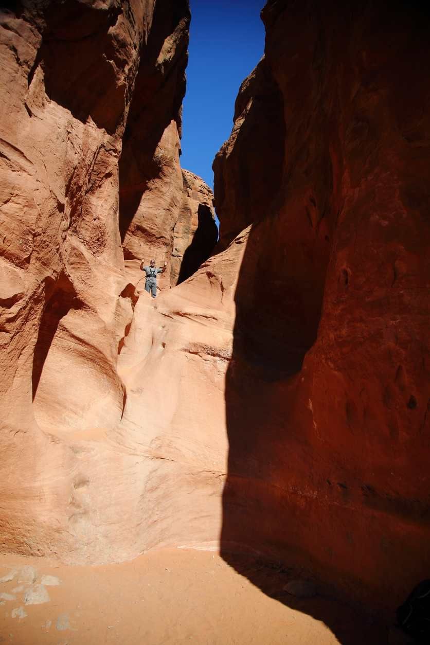 Nous ne mettrons que 40 minutes pour atteindre l'entrée de Spooky, il fait très sombre à l'intérieur mais le soleil va vite entrer pour nous éclairer. C'est vraiment pas large dans ce slot et je me souviens de la phrase de Sylvie " il ne faudrait pas un tremblement de terre sinon nous sommes écrabouillés", on ne peut pas dire mieux. Nous irons au fond du canyon et ferons demi-tour et cette fois ci le soleil est bien présent, maintenant direction Peek a Boo.