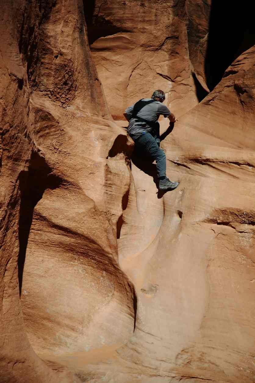 Il faut faire un gros pas d'escalade pour entrer dans le canyon, je passe sans souci malgré mes 69, heuu, mes 69 quoi? Je vais jusqu'à la sortie et reviens sur mes pas, Françoise m'attend car elle l'escalade ce n'est pas son truc. Je la retrouve qui me mitraille à la descente et nous reprenons le sentier direction Hugo III. Nous devons maintenant refaire la piste dans l'autre sens jusqu'au bivouac du soir, une heure trente sera nécessaire pour revenir, il est temps qu'un engin refasse la surface.
