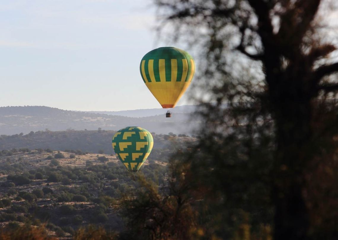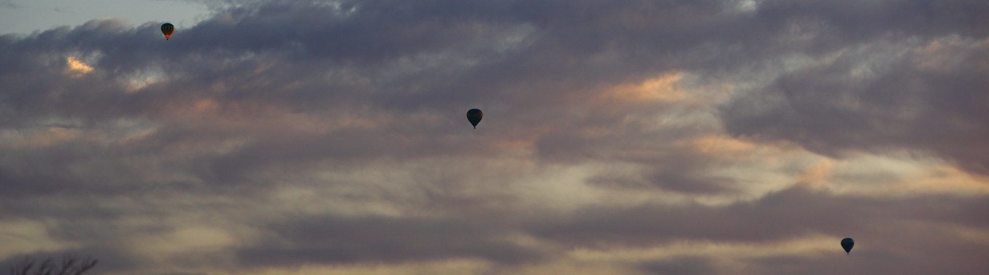 J'ouvre mon rideau de fenêtre et j'aperçois des ballons dans le ciel, je suis vite debout et sors l'appareil photo, il sont cinq, loin des centaines de ballons d'Albuquerque mais cela suffit pour faire quelques images, le soleil se lève doucement derrière la montagne, c'est très nuageux et il ne fait pas froid.