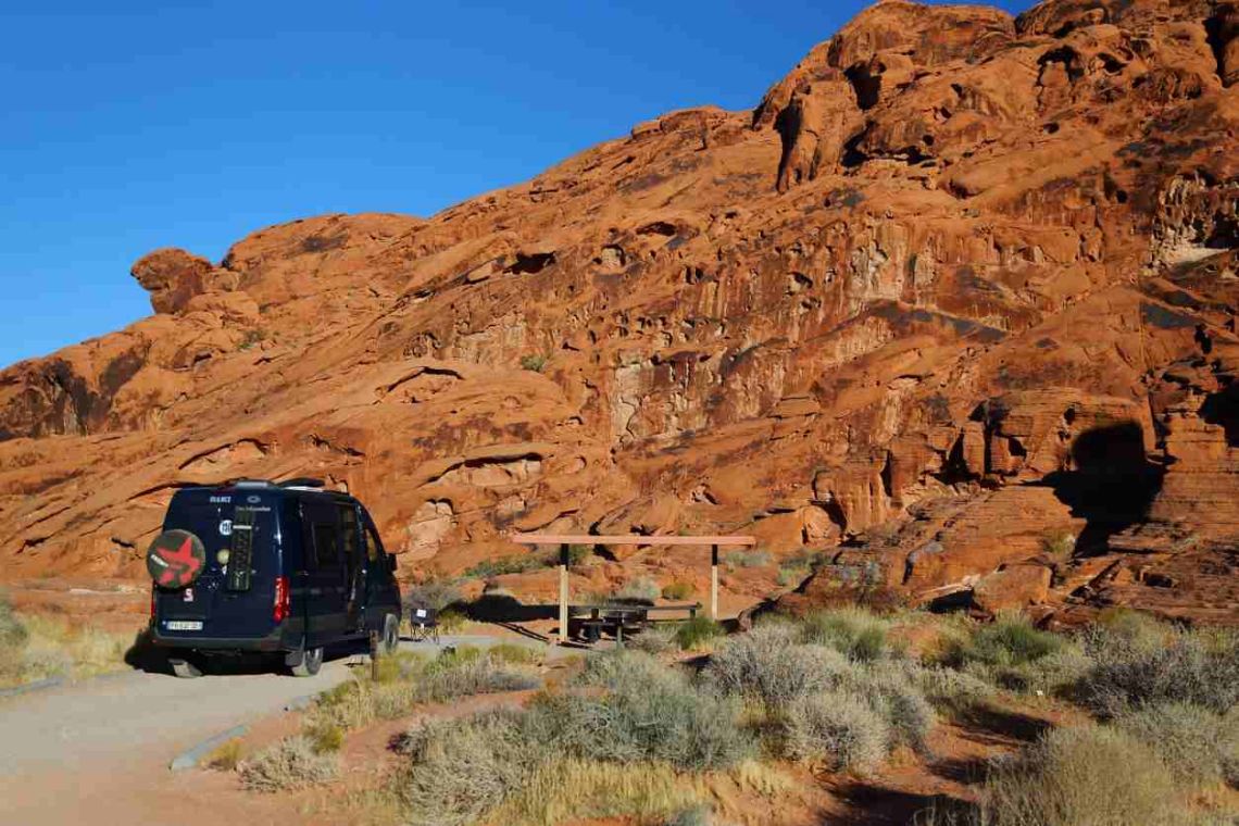 Nous quittons notre super emplacement au bord du lac pour aller dans un autre superbe endroit, la Valley of Fire toujours dans le Nevada et non loin du Lake Mead. La première chose à faire c'est d'aller retenir une place au campground si nous en trouvons une autrement nous reviendrons au bord du Lake Mead. Nous trouvons notre bonheur et retenons l'emplacement pour deux nuits, il ne restait que quatre places disponibles qui seront vite prises.