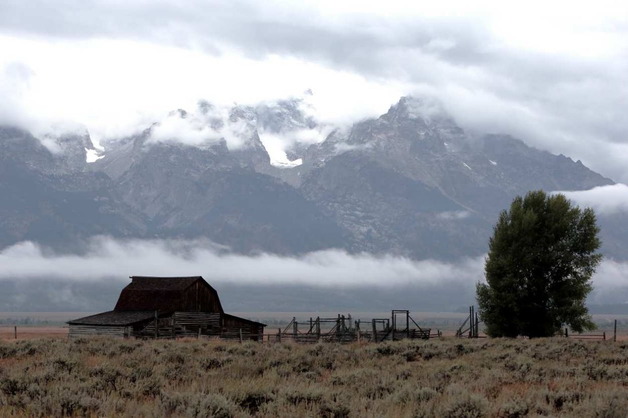 Pluie et neige au programme, bien triste temps mais il nous en faut plus pour ne pas partir dans le Yellowstone. Nous sommes d'attaque pour partir à 7h45 direction le nord sauf que des visiteurs non prévus nous attendent à la sortie du campground, trois magnifiques moose qui se laissent photographier au plus proche. Et c'est reparti pour le nord des Grand Teton, un nouveau stop à la grange des mormons s'impose mais que c'est bouché tout là haut, pas grave nous faisons quelques photos. Nous sommes complètement effarés par la foule qui sillonne ici, c'est du flux continu dans les deux sens, jamais nous avons vu cela, nous commençons à nous poser des questions sur les emplacements pour ce soir. Nous filons maintenant vers l'entrée du Yellowstone, nous y ferons la queue pour passer, aie aie aie, c'est grave.