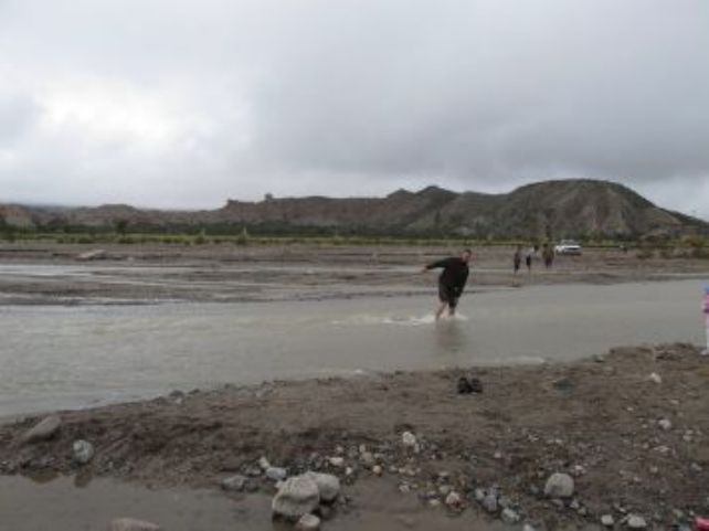 Nous quittons notre bivouac vers 10H30, faisons le plein de gasoil et d'eau. Reprise de la piste vers le nord et arrêt rapide sur un lieu de pêche indiqué par des argentins lors de notre passage du gué hier matin. Nous sommes vite en action dans ce petit rio Punilla et les prises ne tardent pas, trois pour moi, une petite relachée et deux grosses décrochées, deux pour Romney en moins d'une heure, nous sommes satisfaits et ce soir poisson pour changer de la viande. Nous reprenons la piste après le repas, il est déjà 14H30 et nous avons un col de 4430 mètres à passer. Les paysages sont toujours aussi beaux, nous passons le col et restons sur une altitude de 4100 mètres. Nous nous trouvons un bivouac tout proche des ruines d'une ancienne mine d'or (village jésuite). Nous avons la vue sur le salar de "l'homme mort" que nous traverserons demain matin. Il y a du vent nous serons bercés pour la nuit.