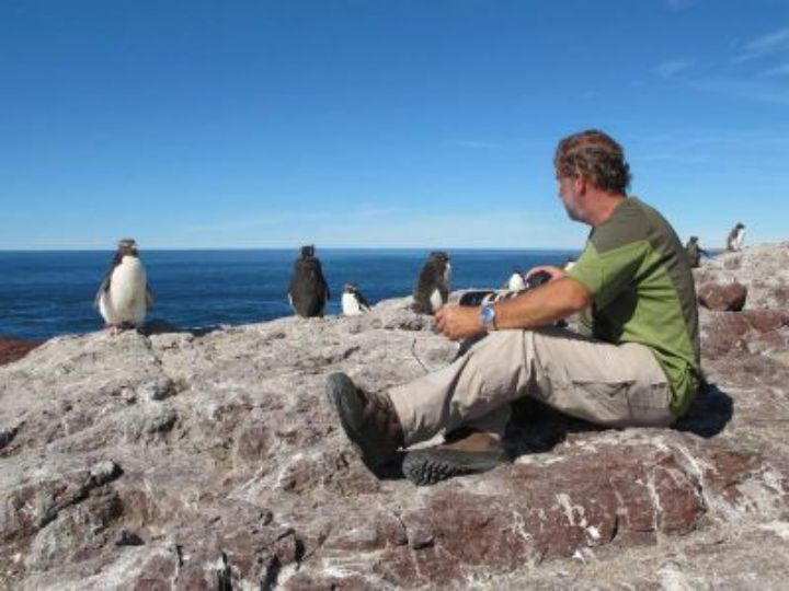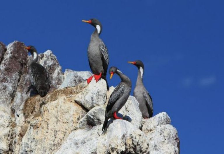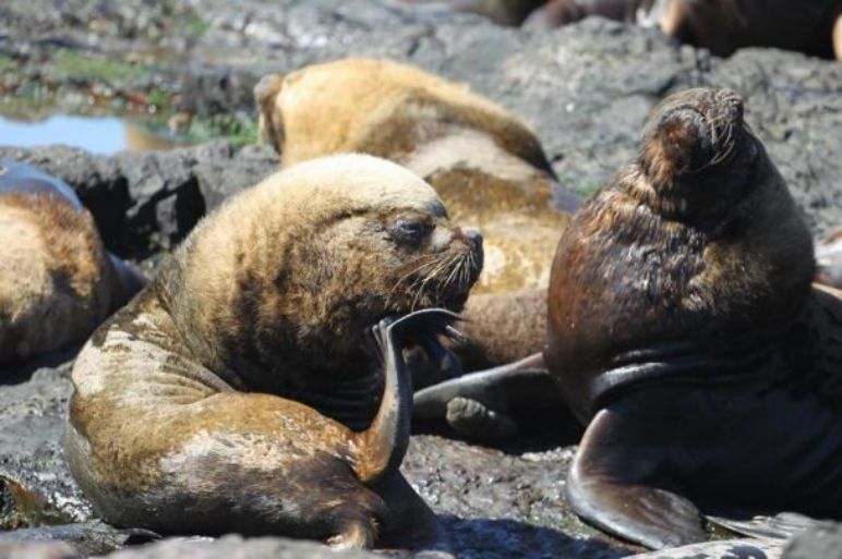 Nous accostons sur cette île vers 10H et nous sommes tout de suite dans l'ambiance, les cormorans gris nous souhaitent une bonne journée. Ils sont magnifiques et ce sont les premiers que nous voyons, les impériaux sont également de la partie. Puis viennent les manchots (pingouins de magallanes), il y en a partout, 30000 sont recensés ici mais le but de la journée c'est de voir enfin les "pingouins amarillos" , là aussi cela sera une découverte pour nous et nous serons plus que satisfaits puisque nous les approcherons presque à les toucher mais c'est interdit et nous le comprenons très bien. Nous verrons également des Skuas, grands oiseaux de plus de un mètres cinquante d'envergure, les petits sont aussi en nombre. En fin de parcours nous observerons les lions de mer qui se prélassent au soleil, oui il fait très chaud encore ce jour pas loin de 40° en bord de mer. Nous rentrerons vers 14h00 après la pause repas, c'est la course entre les deux bateaux de la société, la mer est bonne, pas de vent tout baigne. Soudain grands cris, ils sont là, mais qui voyons? Et bien des toninas, des dauphins noir et blanc, ils vont nous faire la fête pendant plus d'une heure mais ils sont très difficiles à prendre en photo, nous verrons bien le résultat plus tard. Nous resterons ainsi deux heures de plus que prévu sur le programme, merci aux gentils organisateurs. Cette formidable journée nous a complètement crevés et nous aurons un peu de mal à attendre 21H pour aller au restaurant car il est tard et nous n'avons rien à manger. Demain nous verra partir vers le Parque Bosque Petrificado, les arbres pétrifiés.