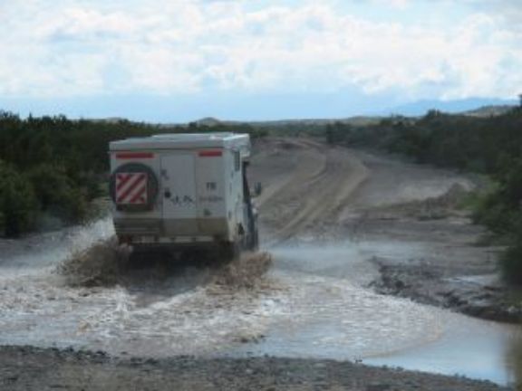Gros orages toute la nuit, je crains pour l'état de la piste, nous verrons bien. Nous quittons notre emplacement de bivouac et nous passons sans aucune crainte. L'état de la piste empire très vite et il va falloir passer quelques gués fortement gonflés par les orages et la boue qui descend avec n'est pas là pour arranger les choses! La piste se transforme en torrent sur plusieurs centaines de mètres et il faut faire attention de ne pas y rester. Finalement nous parviendrons au village de Barreal où nous faisons quelques courses. Nous prendrons notre repas au restaurant et nous continuerons notre route jusque Rodeo, petite ville très connue par les amateurs de Kytesurf car il y a énormément de vent. Romney étant amateur nous nous dirigeons vers le lac par une piste qui n'en est pas une mais un chemin tracé par l'eau. Bien évidemment il y a de grosses flaques mais le piège viendra du sable très mou et surtout avec de la glaise en dessous. Premier ensablement pour moi, pas assez de vitesse, j'y reste et bien enfoncé. Nous passerons une heure pour placer les plaques à sable et heureusement Romney en a quatre paires plus les deux miennes cela devrait aller. Et bien non, ce sol avec de la glaise étant très mou je continue de m'enfoncer. Romney décide alors de me tirer car lui est passé. Ce qui devait arriver arrive, il s'ensable également. Nous avons nos deux véhicules assis sur le sable!!!!!